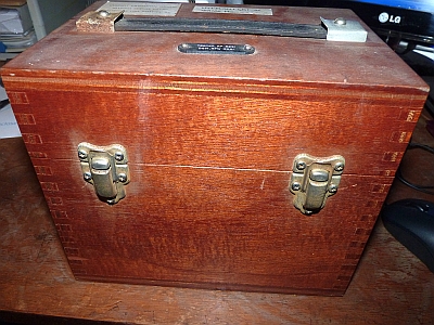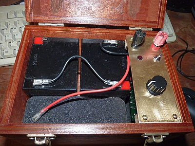 19/8/2017 This is a job that has been on the 'to do' list for the last two years. I finally got around to making it today. I had been thinking about making a variable speed power supply for my steam blowers for some time. Mine are based on the ex MOD radar cooling blowers that appeared on the surplus market a few years ago. They are superbly made as you would expect for something made for the MOD and were only about £5 to £10 each when I got mine (2006ish). People are asking silly money for them now however. I did pick up 3 more in bits so I have plenty of spare parts. They are designed for 24volt working but work quite well on only 12 volts, which is what most people run them off. There are times though when you could do with a bit more draft but 24 volts is a bit too much and liable to suck the fire out through the chimney! Electronic speed controllers are available from China for next to nothing so about two years ago I ordered one that had a rating of 10 amps at 30 volts. I think it was less than £5 including postage. You can't buy the components for that price to make your own. The controller just sat around patiently and today I decided it was time to build the thing. I remembered rescuing some nice wooden boxes from the skip when I worked for BT and a hunt around the junk in the loft produced one of almost perfect size to house the controller plus two 12 volt 4 amp hour sealed lead acid batteries. Unfortunately, they have got a bit damp at some point and the hinges and catches have gone a bit rusty. I quickly knocked up a panel to hold the controller and the other bits from a piece of brass and asembled all the electronics on this panel and mounted it at one end of the box with the batteries at the other.