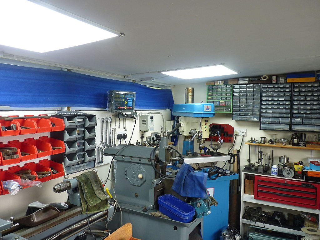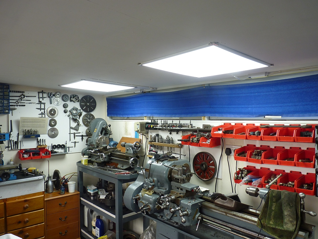 This will just fit between two of the shelves on the shelf unit at the end of the workshop and holds my digital calipers, dial indicators and telescope gauges etc. It seems reasonable quality for the price and has ball bearing slides on the drawers which makes them very easy to open and close. I've still got a lot more calipers etc. but I'll just keep the ones that I use the most here. At the same time I bought some metal drawer boxes as used in fitted kitchens and these will be fitted under the bench when I get the time. I have already fitted two wooden drawers that friend Rod gave me under the bench to hold all my small hammers, screwdrivers etc. I was fed up with having them cluttering up the bench top! I finally got around to buying some 600mm square LED lighting panels to replace the fluorescent fittings over the lathes and the mill. I think I mentioned before that the ceiling is quite low on this side of the workshop and I had to be careful not to bang my head on the fittings! I have recently replaced about fifty conventional 600mm square fluorescent fittings with LED ones in our local social club and I was very impressed with the LED versions. The prices for these fittings are very reasonable now and I paid less than £20 each for them. If they had been available cheaply when I first built the workshop then I would have used them straight away. I've fitted three of the LED units to replace the two old fluorescents. Each of the lathes has one centrally mounted on the ceiling directly over them to give the maximum light on the lathes and the third unit is mounted between the mill and the shaper.