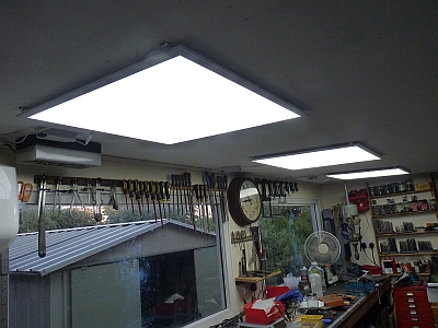 This of course invalidates any guarantee that comes with the fittings but for less than £20 each I'm not bothered. If one packs up then I'll just throw it and buy another one. If you decide to do something similar yourself be very careful that the LED strips are not on the side that you decide to file the slot! The panels have the LEDs mounted on two opposite sides of the panel and they shine across the plastic diffuser to illuminate it. Normally though, I think the cable exits on one of the sides that does not have the LEDs as mine were. I opted for the 6500K panels which give a very white light with a blue tint. This may not suit everybody though but I think it is ideal for a workshop. I recently fitted a 6500K LED bulb in the back room of the house where I normally live and work and I can actually see what I'm doing now! You do get used to the bluish light after a time and I don't notice it now. I will probably replace the two fluorescent fittings over the bench as well at some point in the future. The old fittings won't be wasted. I want one to put in the shed and two will be fitted under the car port. I do have lights under the car port at the moment but the fittings are steel and getting quite rusty now. The fittings from the workshop are plastic so better suited for that purpose. 24/01/2019 One of the new LED light panels started flickering a week or so ago and it seems that the electronic power supply is faulty. I'd got some spare ones from the job that I did at the RBL Club so I just swapped it out. Not worth the hassle of trying to get a replacement from where I bought the panels. 06/06/2019 I've finally got around to replacing the remaining fluorescent fittings over the bench with three more LED panels so all the workshop lighting is now LED. I can really see what I'm doing now!