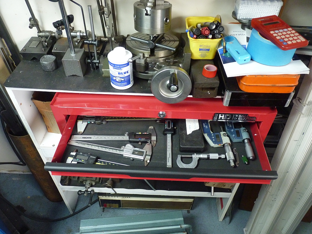 I did have to move the leg that supported the end of the bench from the front to the end of the bench to get both drawer units in. There's room behind the metal drawer units to put long lengths of stock out of the way and room on top to put something, maybe another couple of shallow drawer units. I've also put the old wooden drawers back which had been stacked in the shed taking up valuable room. I was going to fit them under the bench top but they are better back where they were under the mill. Fortunately, I hadn't removed the runners for the wooden drawers when I fitted the Bisley units. I wasn't entirely happy with the way that the Bisley drawer units looked under the mill anyway as it looked a bit of a bodge. Also, I had been storing all the digital calipers and micrometers etc in the Bisleys but finished up with a lot of wasted space due to the shallow drawers in them. I could only get one layer of boxes etc. in each drawer whereas the wooden drawers are much deeper and you can stack boxes on top of each other and get more in each drawer. I'm going to have to run an electric supply to the shed so I can fit a socket for the compressor rather than use an extension lead all the time and I'll probably put a light in there as well. The airline from the compressor is plenty long enough to reach into the workshop if I need to use it in there. I only really use it for blowing bits off that I've machined or cleaned in paraffin etc. and I do that outside anyway. I know a lot of people use an airline for blowing off swarf etc. in the lathe or mill but I've never thought that to be a good idea. The swarf blows everywhere and just makes a mess! One thing I want to try and do is reduce the noise that the compressor makes when it's running. It's horrendous at the moment! I'm wondering if a lot of the noise comes from the air intake? I'll try fitting a pipe to it to see if that acts as a silencer and quietens it down a bit. 11/09/2018 I've decided to make some more modifications to the workshop to improve the lighting and make more storage space available. I've bought two more shelving units to put in the shed and also decided to insulate it using the same aluminised bubble wrap that I used in the workshop. Of course, I decided to do this after fitting the previous three shelving units so I've got to empty those again and move them so that I can get at the wall behind! I'm hoping that the insulation will help prevent condensation and rust which is always a problem with metal sheds. I'm just sticking the insulation to the steel walls using strong double sided foam tape. I've also bought a metal three drawer tool chest for keeping my measuring equipment in so they are all in the one place.
