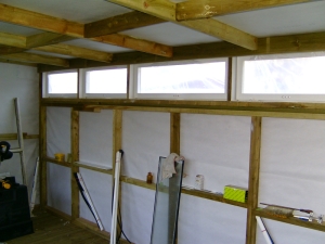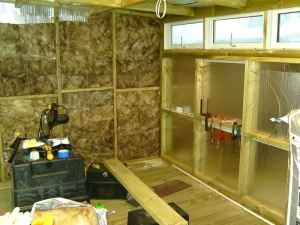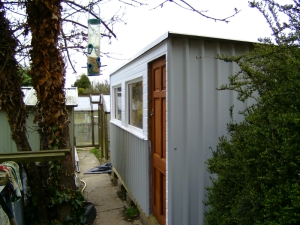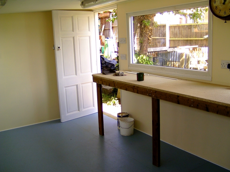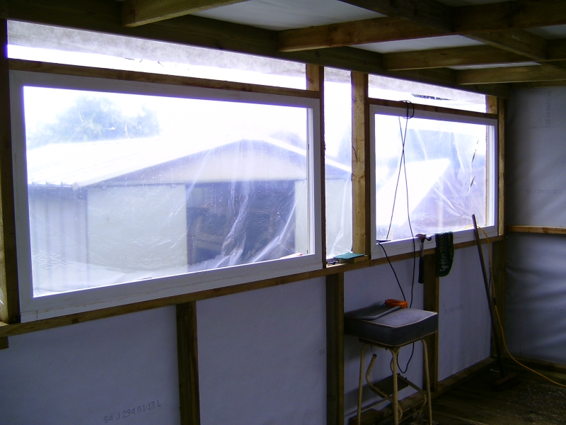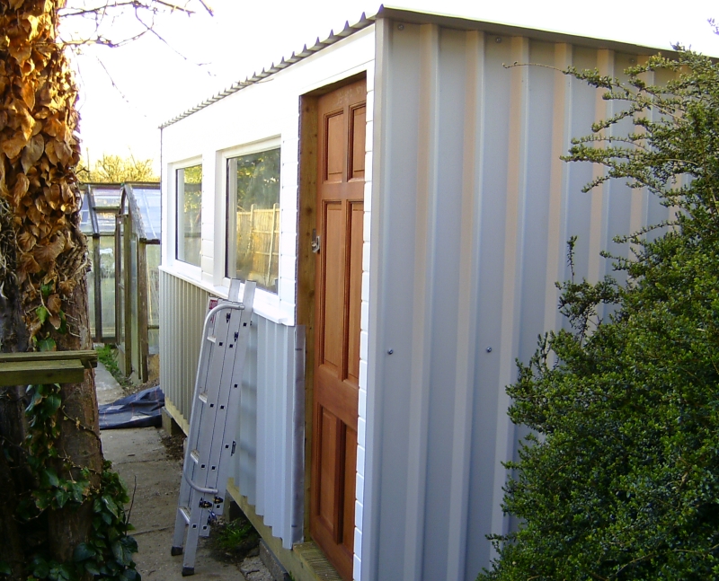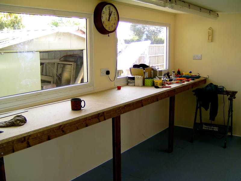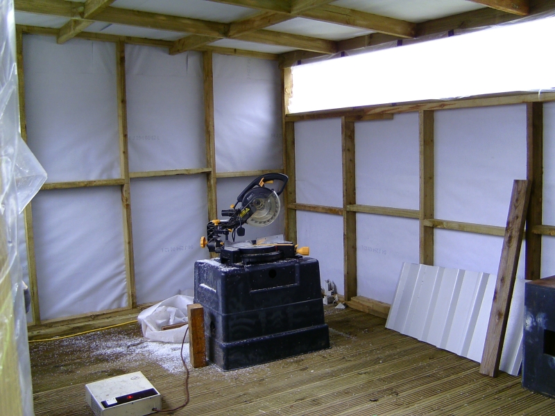 24/02/2011 I made a start on the roof sheets on Tuesday and got all but one sheet in place. Fortunately, there was little or no wind so waving the sheets about as I lifted them on to the roof was fairly uneventful. I would not have attempted this if there had been a strong wind! The weather was not very kind on Wednesday though and I fitted the last sheet and put the rest of the fixings in the others in the pouring rain. It was worth it though to get the job finished. I managed to get at all the fixings by leaning right over the roof from the edges whilst standing on the ladder. Needless to say, I made sure the ladder was very securely positioned and couldn't slip. This meant I didn't have to climb up on top after all, thank goodness. Today I made up the window frame for the opening windows that will go along the top of the back wall and hopefully that will get fitted tomorrow. We did go to the club today as usual but were back by 2pm as Mick wanted to try steaming the American 2-4-4T in the afternoon! I'm going to order some 1 inch thick polystyrene sheets on Monday and some UPVC sections to finish off around the windows etc. A couple of photos of the inside so far: 04/03/2011 Not a lot done over the last few days due to other work. The window frame was fitted in the back wall last week and today I glued strips of UPVC to the outside of it with silicone sealer and made a start on covering the inside faces of the window openings. The strips were cut from a couple of sheets of UPVC salvaged from an old door panel. The sheets were originally glued either side of a sheet of polyurethane foam but I managed to peel them off the foam quite easily. More recycling! I also finished the front window frames by gluing the corner joints with silicone sealer and hung the door. The door is a very nice hardwood paneled door that was bought by someone to replace the front door on a flat they owned but they bought one too wide and it couldn't be cut down enough to fit. They didn't bother taking it back so it's been sat under my car port for several years. I was getting fed up with it stuck there and was going to get rid of it but fortunately I didn't! Just goes to show that all this hoarding of stuff does pay in the end! The insulation will have to wait a bit longer as I realised the other day that the annual fee for this website is due later this month so I can't afford it until next month now. I haven't ordered the UPVC bits as planned either but may do that this weekend. 08/03/2011 I've finished off the insides of the rear window frames and have now fitted all the windows themselves but still have to refit the sealed units and the locking mecanisms. I stripped all the windows down to give them a good scrub as they've been lying around for several years! All of the units have misted up slightly due to failed seals but they will do for the time being. They still let light in and I'm not bothered about looking through them. The view is not very inspiring anyway - it's next doors garage! I made the gaps in the window frames a bit tight and they could have really done with being 1/8" wider. The windows and hinges only just fit! I can't find the locking keeps for the windows and I might have thrown them away (unusual for me!) so I'll either have to buy some more or simply make some from bits of angle. Rear windows fitted and waiting for the units to be put back I ordered the plastic cladding etc. yesterday to finish off around the front windows and had a phone call to say it would be delivered today. Unfortunately, when the delivery van arrived, there was only a small package containing some more silicon sealer and some cladding nails. The main package containing the cladding etc. had not been put on the van! The driver was very apologetic and promised it would be delivered tomorrow. No big deal but I was hoping to get the front finished tomorrow. I might do yet if it comes early enough. I started sorting out the glazing strips for the front window frames. These will all have to be cut down to fit the new frames but that's easy enough with the chop saw. I seem to be missing the rubber strips that hold the glass in on the inside of the frames and I think I do remember throwing them away, thinking I would never need them! I had a search on Ebay and there are several window companies that sell the rubber sections by the metre so I can soon get some replacements. The only thing is that there seem to be dozens of different shapes and sizes so it's a question of getting the right one! I might get enough to replace the whole lot as some of the old ones have gone a bit stiff and don't seal all that well anymore. What I would like to find is a supply of the aluminium spacing bar that's used to separate the two panes of glass in the sealed units. I could then repair the misted units in the windows rather than buy new ones! 09/03/2011 The promised delivery of the missing plastic never materialised so we'll see what tomorrow brings! If nothing appears tomorrow, there will be a few phone calls being made. I fitted the sealed units into the back windows and fitted the locking mechanisms and handles. Had another search for the missing keeps but with no success. Tonight I cut and fitted the glazing bars for the front windows but I don't seem to have all the seals for those either. I'm going to have to sort out replacement ones and get an order sent off. 13/03/2011 The plastic cladding didn't appear on Thursday either! I rang up the supply company who were very helpful and promised to chase up the delivery and see what had happened. They rang the next morning to say that the delivery company could not find the package. How can you lose something 5 metres long! Anyway, the company have sent out another batch which should be here tomorrow (Monday). In the meantime, I've done a few small jobs. I ordered some new seals for the front windows on Thursday and they arrived next morning at 7.00AM. I've drilled holes through the frami