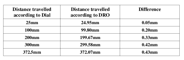 I was curious to see how the readings on the new DRO would correspond with the travel obtained by using the dials on the leadscrews so I did a quick test of the x and y axis. One complete turn of the leadscrew dial equals 2.5mm so I set the x axis dial to zero, zeroed the DRO and then turned the leadscrew by 10 complete turns of the dial making sure I took into account any backlash in the dial and leadscrew. In theory, the distance travelled by the bed should be 25mm but the DRO read 24.95mm, 0.05mm less than it should have been. I tried this at different positions of the leadscrew but the results were all very similar with the DRO reading about 0.05mm less than the distance set by the leadscrew dial. I then did a comparison at every 100mm as indicated by the leadscrew dial and the results showed a fairly consistent error.