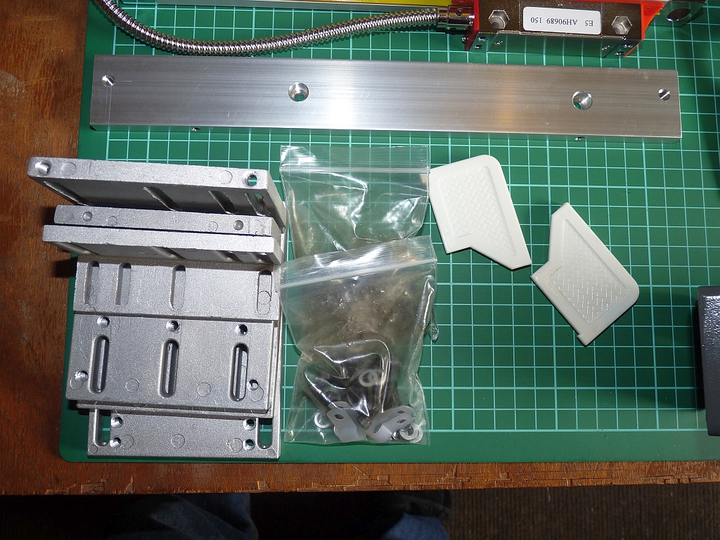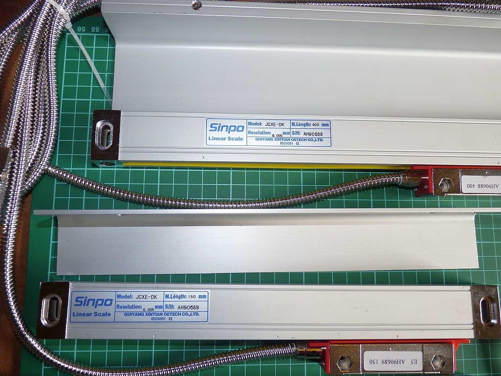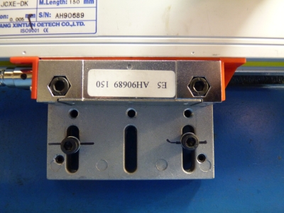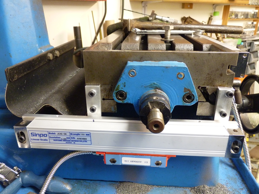 When I was determining the position of the reader head I left the plastic transport strip in place between the reader and the scale. I then clamped the reader to the scale before marking the position of the mounting holes. That ensured that the reader was parallel to the scale. The transport strip was then removed once the head was bolted on. Next job is the Y axis scale which will not be so simple unfortunately! One thing I noticed was that I think there should have been a length of aluminium bar in the kit for mounting the X axis scale to but it was missing. The idea is that you mount the bar to the mill and then bolt the scale to the bar. There is one for the Y axis though. As it happens, I didn't need it for the X axis so no problem. Also, the cables for the scales are way too long. I could mount the display down the other end of the shop! I suppose the manufacturers have to allow for every possibility when the kits are fitted. I could shorten the cables quite easily if necessary but I'll probably do what everyone else seems to do and just coil up the excess. 21/04/2018 The easiest way to mount the Y axis scale seemed to be to hang it off some brackets attached to the lefthand side of the Y axis casting. It couldn't be simply bolted to the side of the casting as the leadscrew assembly was in the way and the scale needed to go below this. The righthand end was not really suitable as the two locks for the Y axis are on this end and I wanted to keep those. In any case, the lefthand side is nearer to the display unit. So, I cut two lengths of aluminium bar and attached these to either end of the casting with two 5mm bolts. This meant drilling and tapping the casting. This time I used the mounting bar for the scale that came with the kit and this was bolted to the two bars attached to the casting.