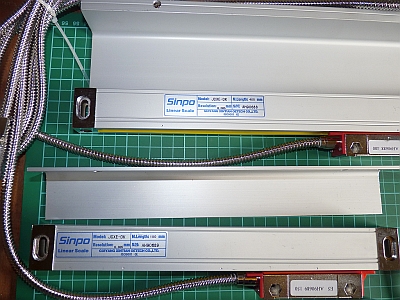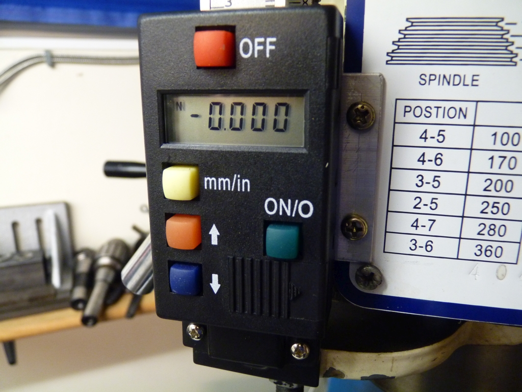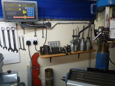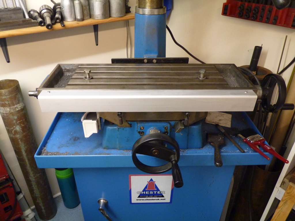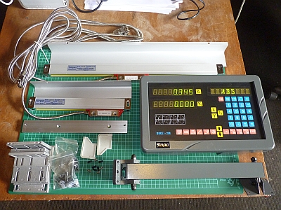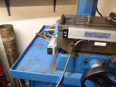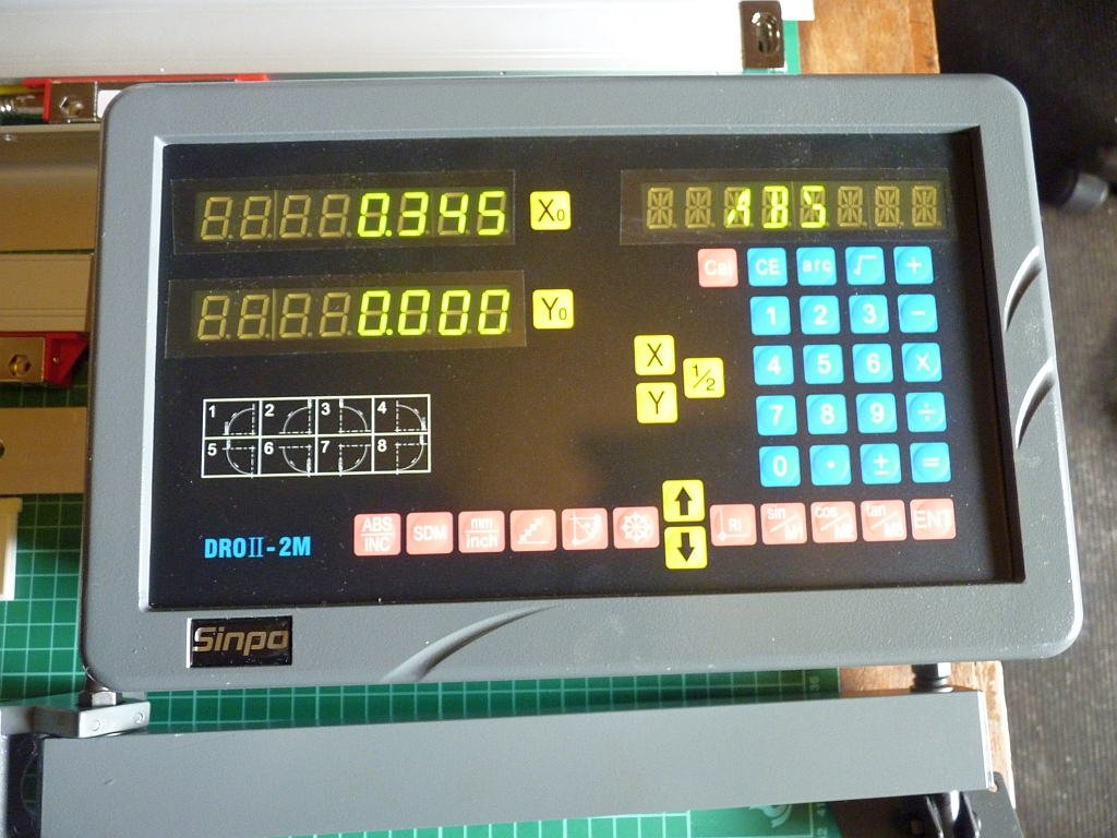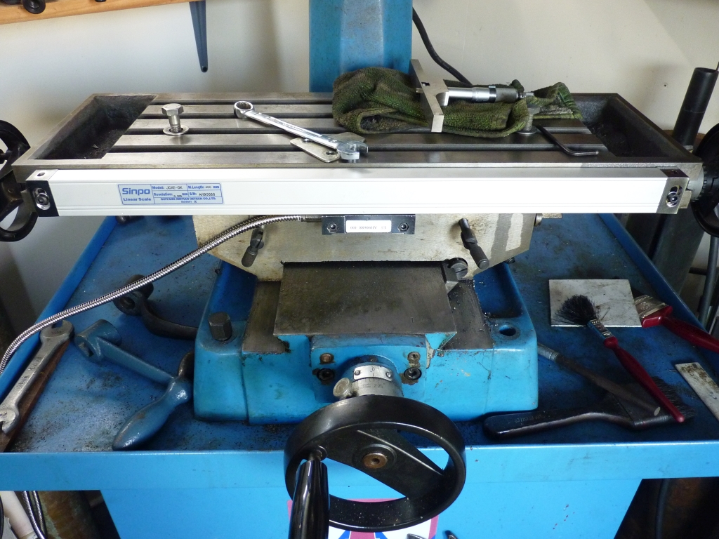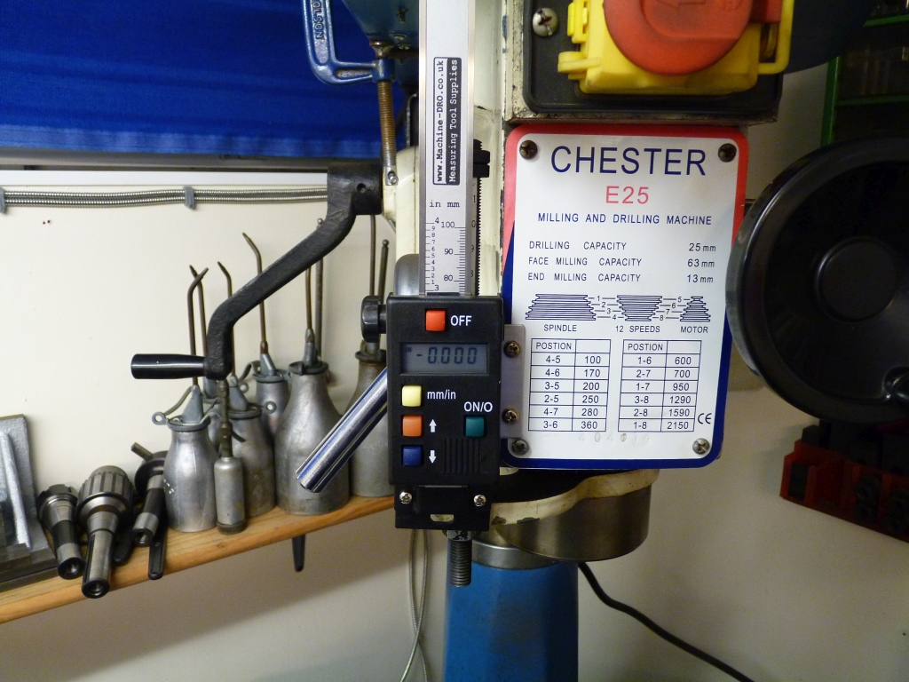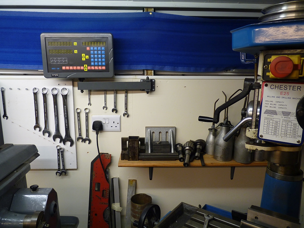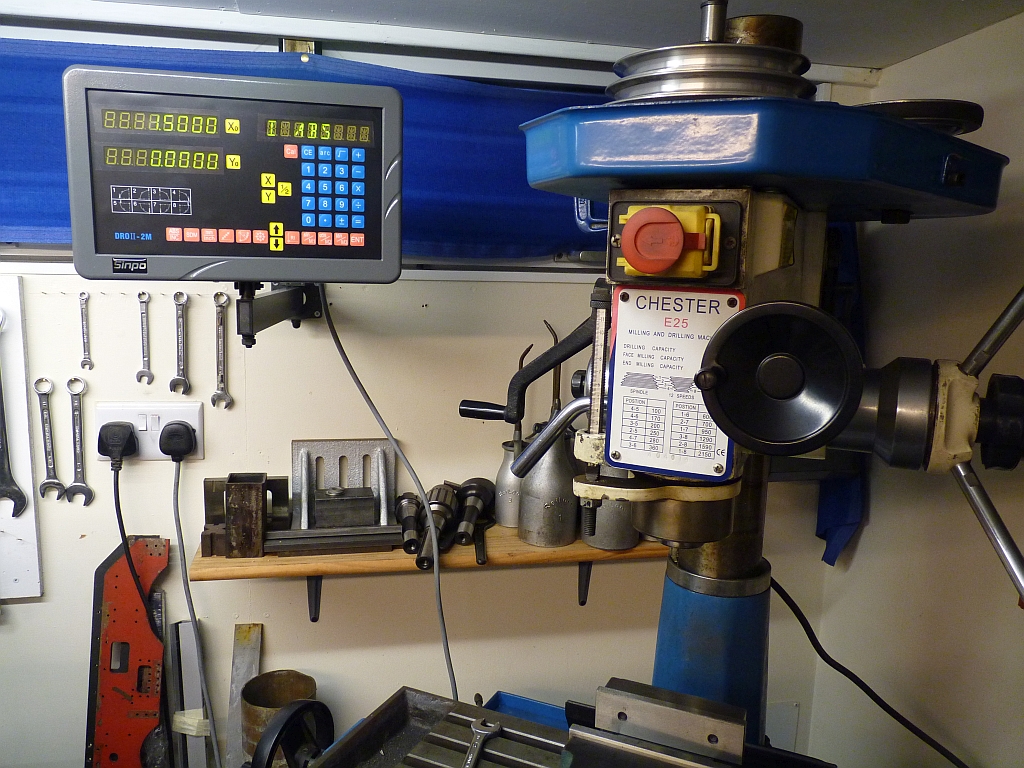 Eagle 25 Mill by Chester UK At long last I've finally picked up a bigger milling machine! This was bought off Ebay at a very good price and is virtually unused. My brother and I travelled to Stockport to collect it and managed to get it in the Astra Estate by unbolting the column from the base and removing the head. It was still a struggle but worth it! I've stripped it down completely and cleaned all the sand, grit, and swarf from the castings and holes and then rebuilt it. It's worth doing this to all these cheaper Chinese mills as the cleaning of the parts in the factory before assembly leaves a bit to be desired. It came with the 4 inch machine vice and a collet set with metric collets. It's a metric machine (not that I'm bothered about that!) with an R8 spindle which I think is better than the MT3 spindle as it's easier to remove the R8 tooling. Unfortunately, the collet chuck and collets are a non-standard spring type (Chinese brand). They are very similar to the normal ER collets but a different size and taper so it's not easy to get other collets to fit. It would be nice to get a set of imperial collets as well as the metric ones as most of my endmills etc. are imperial sizes. The mill came without a drill chuck so I need to pick one of those up sometime, also a proper clamping set would be useful. I can see changing the spindle speed will be a bit of a pain as this involves moving two belts and undoing a couple of bolts. I've got a spare 1HP, 3phase motor and I think I may eventually fit this along with an inverter to vary the speed. Much easier! The machine is too big to go in the house workshop so at the moment it is outside the back door in the covered area that runs down the side of the house. Not ideal but it will have to do for now. I am also getting an old Denham Junior lathe from a friend at the club so that is going to have to be found a home as well shortly! I can see that I am going to have to eventually build a proper outside workshop! 12/09/2017 The mill has been giving good service in it's new home in the new workshop but there are a few improvements that I want to make to it. I have yet to fit an inverter drive and a three phase motor to make changing the spindle speed much easier. Having to change two belts has proved to be an absolute pain and it's very awkward to do. Consequently, I tend not to change speed at all if possible. I have picked up a faulty 3HP inverter off Ebay that I'm hoping to repair and fit along with the new three phase motor at some point. The second improvement has been on the cards for some time and that is to fit a two axis DRO to the table. As mentioned above, the machine is metric but I do most of my work in imperial so I have to convert everything. That's not a problem really but can lead to mistakes being made. The DRO will solve that problem as it can be switched between the two systems. It will also be far more accurate than relying on turning dials which can also lead to mistakes! It eliminates any problems with backlash in the feedscrews as well. I already have a digital readout for the quill feed. I bought it at one of the model engineering exhibitions at the Fosse a few years back but never got around to fitting it. I decided to bite the bullet a couple of weeks back and buy a two axis DRO kit and use the scale that I already had for the Z axis.. I went for a chinese 'cheapy' direct from China ( advertised on Ebay ) as they are so much cheaper than the ones sold in the UK, most, if not all, of which are no doubt made in China anyway. I didn't go for the cheapest ones but a set made by Sinpo which seem to have quite a good reputation. This came with glass scales with 0.005mm resolution. The actual accuracy will be less than that but far better than I can achieve with the dials. I measured the actual travel of the table in X and Y and added a bit to get the working length of the two scales. I ordered a 150mm travel for the Y axis and a 400mm for the X axis. The kit took about two weeks to arrive and I had to pay £21 in VAT and other fees when it was delivered. Remember that if you order items with a reasonably high value from China etc. you will be liable to pay import duties and VAT when the item arrives. I think the sellers usually give the items a far lower value than they are actually worth to keep the extra payments as low as possible. You may find that the courier will also add a fee as they have to pay the duties on your behalf before they can collect them from the Customs and they charge you for this. The DRO kit arrived this morning as two separate parcels and was well packed and everything was in good order. The kit consists of the display unit and mounting arm, the two scales, covers for the scales, and various brackets and nuts and bolts for mounting them. From what I have read, you usually have to modify these brackets or make your own to suit the particular milling machine. These kits are not a simple bolt on job! The kit also included a pressed steel plate for holding collets etc. I connected up the scales to the display and switched it on and everything seems to work as it should. The only slight problem was that the mains lead had a continental type plug on it which is no use in the UK. I have plenty of suitable leads but I may just chop the plug off the lead that came with it and fit a proper UK 3 pin plug instead. I haven't studied the manual yet but I gather that they can be hard to follow and understand as they are usually written in 'Chinglish'!