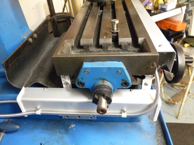 I tidied the cables up by fastening them to the bar that supports the display and fastening them to the wall behind the mill with cable clips. The spare cable just hangs down behind the mill. I might do something a bit better with the Y axis cable as that moves with the table and at the moment it just slides over the back of the swarf tray. There is enough slack in the cables for them not to be strained when the display is moved forward for use. I also shortened the mains lead which was way too long.