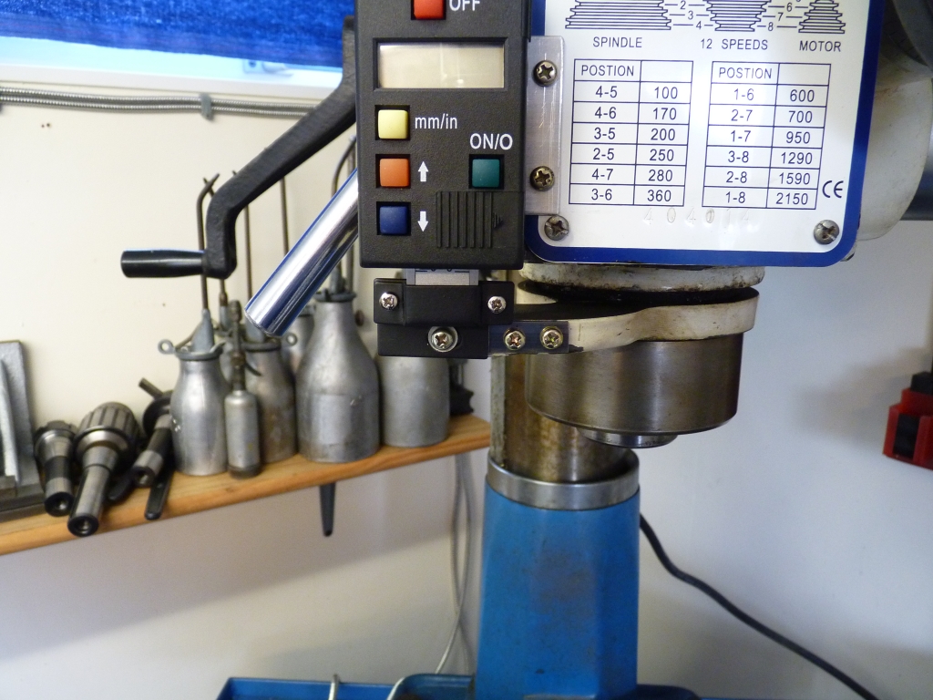 I measured the diameter of the end of the screw and compared it with the width of the keyway and no wonder there is so much rotation. The end of the screw is 6.87mm in diameter but the keyway is 8mm wide so there is about 1.1mm of play! I could just make a new screw by machining the end of another grubscrew but I'm still not happy with this method. There is only a very small area of contact between the end of the screw and the sides of the keyway, in fact you can see where it touches in the above photo. The end of the screw has a small polished area. Ideally, I would like to fit some sort of square key to give more contact area but that could be easier said than done. I don't really want to have to remove the quill from the head if at all possible. I'll have to think about it some more. Maybe I'm worrying about something that may not be a real problem? 28/04/2018 Having thought about the problem with the play in the quill keyway, I've decided that to change the way that the quill is prevented from rotating would involve a major strip down of the quill and head and so I'm going to leave it as it is, at least for the time being. Instead, I machined off the too small diameter end of the grub screw and remachined it to give a good fit in the quill keyway. This has left the screw a bit too short to take the locking nut but I've ordered some longer grub screws and I'll make a new one when they arrive. I think the problem with the end of the original screw being too small in diameter is that the manufacturer has probably used an off the shelf dog point screw rather than machining one specially for the job. The quill now had no rotational play in the head and so I could finish fitting the digital readout. This was a simple job involving making a bracket that screwed to the casting on the end of the quill that the depth stop fastens to and then fastening the end of the scale on the readout to this. Job done and a lot easier than I thought it would be.