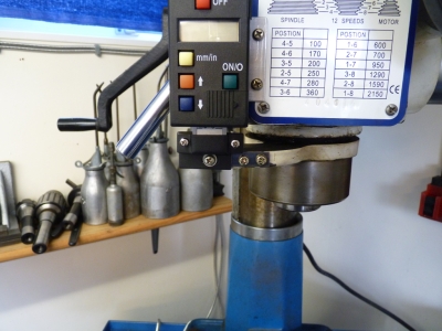 I'm waiting for some push buttons to arrive to make up remote controls for the inverter as I've found that the plastic covers on the buttons on the inverter itself don't last very long if you use those all the time. I purchased a plastic box to house the remote push buttons but instead I've decided to make a panel to replace the old on/off switch assembly and the gear change chart on the front of the mill. There is a cavity behind the switch/chart which should be deep enough to take the buttons and the controls will then be easy to access and use. The inverter seems to work fine and is definitely better than the one fitted to the ML7 lathe. The new one has 'Vector Control' which means that the motor torque is automatically increased as the speed decreases so you still have plenty of torque at very low speeds. The older inverter on the lathe does not have this and you can stop the spindle quite easily when it is running at low speeds. I also purchased a digital rev counter to fit to the mill spindle so that it would be easy to read the speed that it is set to. However, when I studied the instructions that came with the inverter, it is actually possible to set the display on the inverter to directly show the spindle speed so I've done that. It was just a case of setting one of the parameters of the inverter to show the frequency of the output required to give a certain rpm of the motor and hence the rpm of the spindle, making an allowance for the ratio of the drive pulleys (0.84 to 1). I may fit the now redundant rev counter to the ML7 instead where it would be useful. At the moment I have to refer to a chart I made to work out the spindle speed. The only gripe that I've got with the new inverter is the 'manual' that comes with it. It is just a folded sheet of paper and although it does tell you what all the parameters are that can be programmed into the inverter, there is no real explanation of what they all do or how to best set them up. Fortunately, the factory settings seem to work ok but it would be nice to be able to tweak the settings to get the best results out of the inverter/motor combination. I did manage to work out how to set the basic parameters and how to set the display to show the spindle rpm though. One complaint I've seen about these cheap inverters is that the cooling fan/s run all the time and they can be very noisy. However, on this inverter the fan only runs when the start button is pressed so the noise of the fans is not really noticeable as it's drowned out by the noise of the mill running. It is noticeably quieter though than it was with the old drive system although there is a bit of vibration at certain speeds. That may be caused by the belt vibrating and perhaps it is not tight enough at the moment. 10/08/2018 The push butons that I originally ordered turned out to be too deep to fit in the recess in the head of the milling machine so I ordered some smaller ones. I wasn't happy with the 'feel' of the original ones anyway. I also ordered a 10 turn pot to control the speed as the one on the inverter itself gave a very coarse adjustment. I made a new panel to fit on the front of the head and mounted the push buttons and the speed pot onto that. I found a length of multicore cable suitable for connecting them to the inverter and wired everything up. I had a bit of fun trying to decipher the settings in the 'manual' in order to program the external controls but got there by trial and error.