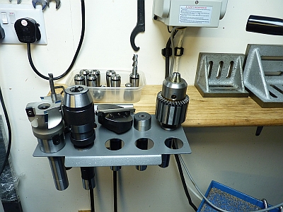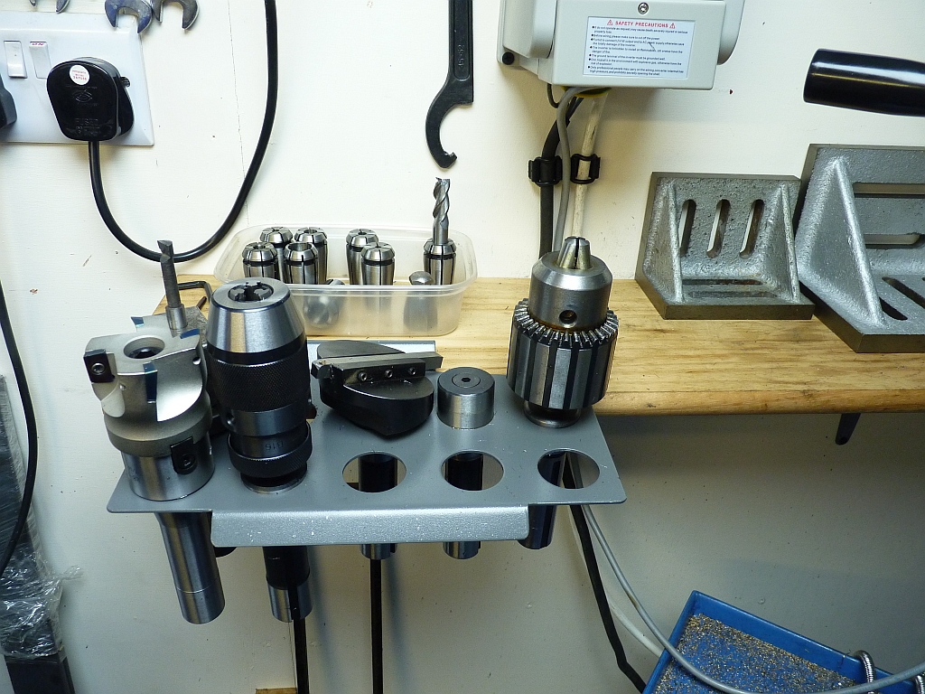 I could do with a rack for collets as well but for the time being I've taken them out of the plastic case they were in and put them in a plastic tray on the shelf. It's much better having them there rather than having to get the plastic box out every time I want a collet. It would be nice to get some imperial collets (they are all metric) but I believe they are a non standard size. The set came from Chester with the mill and are a chinese brand. The set seems quite good quality though. I would probably have to buy a complete new set to get the imperial sizes. I'm not overly impressed with the keyless chuck that came from Banggood. It has a lot of runout and needs to be really tightened hard to grip small drills properly. I did check the runout of the R8 adapter and the runout is only 0.0006" so it is the chuck that is the problem. Perhaps taking it to bits and giving it a good clean would help. It's probably ok for drilling though and it does make changing drills a lot quicker and easier. I've tried using the facemill a couple of times without much joy. It makes a lot of noise but doesn't seem to cut that well. It could be me not using the correct speed etc. I'll have to have a play with it on some scrap. Maybe that play in the top bearing spindle is not helping?