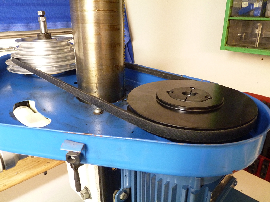 I then had to order a new pulley for the motor and a suitable belt. I decided to use the second groove from the bottom on the spindle pulley and as I wanted a 1 to 1 ratio for the drive, I ordered a 175mm diameter pulley to match that. The pulley I chose was a cast iron one with the taper lock fitting. I ordered the bits from Simply Bearings as I've always had excellent service from them and ordered the belt as well. They have a belt length calculater on their website and I used that to order a suitable belt. I wasn't sure if I would get the right length for the belt first time around so I was prepared to have to order another one after trying it in place. They are not very expensive anyway. 19/07/2018 The pulley and belt arrived today so I had a quick trial fit. The pulley fitted the motor shaft perfectly but the shaft was not really long enough and the pulley would have to fit onto the shaft only part way for the belt to line up properly which wasn't very satisfactory. Also, the belt was too long!
