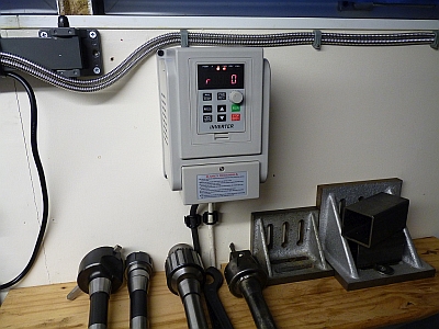 Then I came up with plan B - use the bottom groove in the spindle pulley. This would mean that the drive ratio would be less than 1 to 1 but at least the belt would line up with the motor pulley fully on the motor shaft. Unfortunately, the belt was now too short! I've ordrered another one slightly longer which should be just right. I was a little concerned with the maximim speed that the new cast iron motor pulley could be run at but according to the information on the Simply Bearings website the maximum allowed rpm of the pulley can be about 4,360 rpm. This will mean a maximum spindle speed of getting on for 4,000 rpm which is probably far higher than actually needed. 30/07/2018 The longer belt duly arrived and it was only just long enough so I could have gone up another size. However, the new belt is not overtight so I'll leave it as it is. The inverter arrived a few days ago and so I've connected that up as well. I've used four core screened lead for the connections to the motor as I've seen that suggested to reduce interference to other equipment. I reused the original mains lead as it was already there with the plug on the end! I mounted the inverter on the wall behind the mill next to the DRO display.