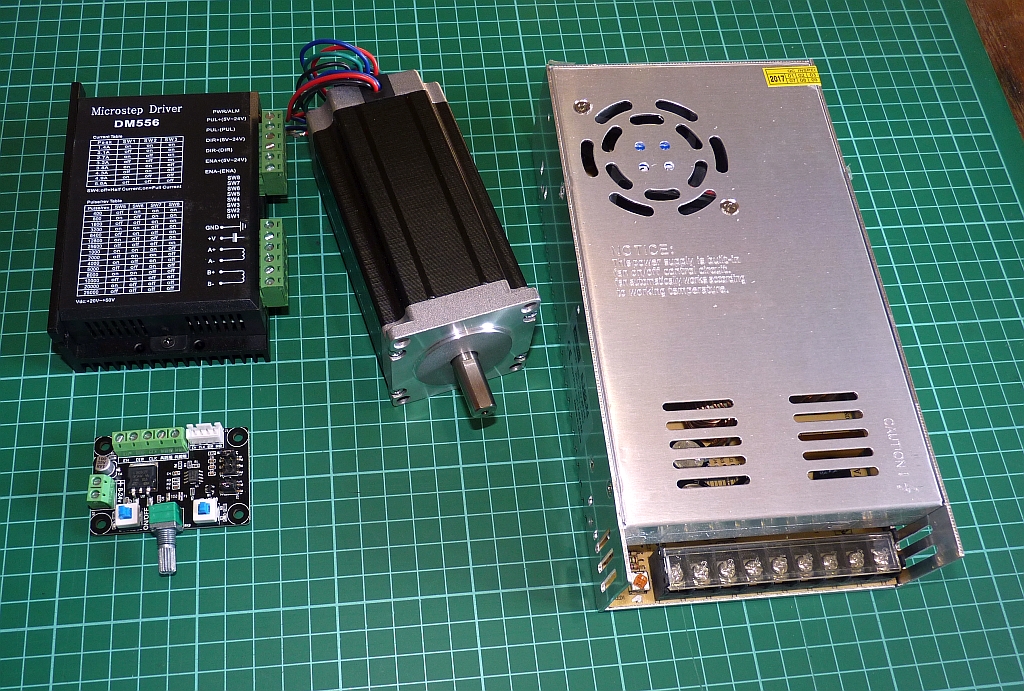 I've got the idea for the feed from the one that myfordboy featured on his YouTube channel. The stepper motor is a Nema 23 3Nm with a DM556 driver and a 24volt 15amp power supply. The speed control is done by a MKS OSC oscillator board which controls the stepper motor driver board. This is something that I've never really had any dealings with before so it was easier to copy someone else! I sourced all the parts from sellers on Ebay. Myfordboy linked to a seller abroad for the stepper motor and driver (Steppersonline) but the postage was nearly as much as the cost of the two components so I gave that a miss. The stepper motor actually came from the same seller but on Ebay the postage was free as it came from the UK. The total cost so far was just over £70. This electronic stuff is really cheap nowadays. I am going to try coupling the stepper motor directly to the end of the leadscrew without a means of disconnecting it as the stepper motor is quite easy to turn when it's not powered. I've ordered a Lovejoy coupling to do this which can be bored to suit the diameter of the stepper motor shaft and the leadscrew. I'm assuming that the stepper driver has reverse voltage protection on it's outputs so that it is not damaged by the voltage generated by the stepper motor when it is rotated. I've seen another chap on YouTube connect the stepper motor permanently like this and he doesn't seem to have had any problems. If it doesn't work out then I'll have to add some means of disconnecting it when not in use. I had originally looked at fitting a commercial power feed but none of them suited what I wanted. The Bridgeport type hang down too low from the table and would have hit the top of the stand and the Warco type only seem to fit on the righthand end of the leadscrew whereas I wanted the controls on the lefthand end. Hence the decision to make my own. It will also be considerably cheaper (and a possible step towards CNC!) 21/12/2018 I was using the mill the other day for making a new weighshaft for the Winson Britannia and the vibration was really bad at about 1000rpm, the speed that I was running a carbide 12mm endmill at. I decided to have a quick look and see if I could find something out of balance and tried loosening the belt a little. That made a huge difference so it looks as though I may have had the belt too tight. There is still vibration there but nothing as bad as before. It's not from the motor or the motor pulley as I took the belt off and ran the motor through various speeds with no vibration at all. It looks as though it may be the belt that is still causing the problem, unless the original aluminium pulley on the spindle is out of balance? When I bought the DRO kit it came with a sort of tool rack for R8 tooling. I was never sure where this was supposed to fit so I drilled a couple of holes in it and screwed it to the front of the wooden shelf behind the mill. That has tidied things up a bit as before I just put the R8 tooling on the shelf itself. With the rack it takes up less room with it being stored vertically.
