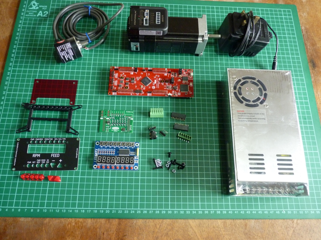 23/07/2021 I have been interested in converting the ML7 to an electronic leadscrew ever since I started watching the YouTube videos by Clough42 where he describes the design, developement and construction of the ELS for his own Grizzly G0602lathe. I hate messing around with changewheels! So what is an electronic leadscrew? I would recomend watching James's videos to learn all about it but basically, instead of driving the leadscrew using gears the leadscrew is driven by a stepper motor or servo motor. The lathe spindle drives a rotary encoder which monitors the rotation of the spindle and outputs pulses as it does so. These pulses are fed into a 'computer' which then outputs signals to drive the stepper motor/servo motor. The ratio between the rotation of the stepper motor/servo and the rotation of the lathe spindle is determined by the software installed on the 'computer' and the required relationship is entered into the 'computer' by a simple keypad and display console. The console displays the threads per inch chosen when using the lathe for screwcutting and also the feed per revolution of the spindle when using the ELS for fine feeds when turning. One thing that is useful is that the lefthand part of the display reads the rpm of the spindle. This reads all the time, even when the ELS part of the electronics is turned off. I was intending to fit a rpm meter to the lathe at some point but now I won't need to. The 'computer' used is a standard microprocessor board available from Texas Instruents. The display board is available as a kit from James who has an Ebay shop in the USA. All the other components are off the shelf items available everywhere but I ordered most of them direct from China as that is a much cheaper option and the delivery time was not too bad. I chose to go with a servo motor rather than a basic stepper motor as the servo motor will compensate for any lost steps that might occur with a stepper. That's not too important for a mill table feed or a lathe saddle feed but not good for screwcutting as the thread will be damaged or deformed if the leadscrew gets out of sync with the spindle. Here's a photo of all the major components: