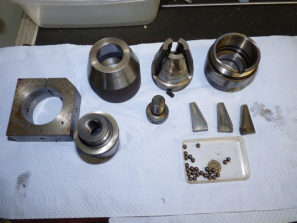 The original collars have a slotted head screw for the clamping screw but I used a 4mm hex cap head bolt instead. The knurling on the edge of the collar didn't come out too well. My clamp style knurling tool wouldn't stretch to a large enough diameter so I used an old single wheel knurling tool that I got from somewhere. I don't think the wheel is very sharp and it took a lot of pressure on the tool to make it cut at all. I don't like using these single wheel knurls as you put a tremendous side pressure on the spindle and the bearings which doesn't do them any good. There is enough of a knurl though to get a good grip on the collar for tightening the chuck. Unfortunately I can't fit it yet as I have to remove the R8 arbor from the chuck as the bore of the collar is smaller than the end of the arbor. I need a pair of chuck removal wedges but the only ones that I can find are out of stock at the moment. Actually, this was attempt number two at the collar as Mr Bozo paid a visit when I was doing the first one. I had faced one side of the blank and bored it to a good fit on the chuck and called it a day as it was getting late. It was when I looked at some other chucks to see what diameter the collars were that I realised I had bored the blank to fit the wrong bit of the chuck! I had bored it to fit the main body of the chuck (the same size as I made the clamping tool for disassembing the chuck) instead of the smaller diameter that the arbor fits into. Oh well, I've got two tools for disassembling the chuck now! Incidentally, I used the Albrecht chuck for drilling the holes in the collar and it worked fine so it was £18 well spent. 28/01/2019 The Rapid chuck arrived today and it seems to be ok apart from it feeling a bit 'sticky'. The chuck has a bit of corrosion on it but nothing too serious. Maybe it's been left lying around somewhere damp. I stripped, cleaned, greased and reassembled it the same as I did for the Albrecht and it works very smoothly now. The body is a different diameter to the Albrecht so I utilised the 'Mr Bozo' collar that I started to make for the Albrecht to grip the body to unscrew the hood. I just had to put it back in the lathe and bore it out a bit more. The jaws look brand new and have no wear at all so I guess that it has had new jaws fitted at some time. The hood wasn't all that tight to remove so it may well have been apart before. The grease inside looked old though and had gone quite hard. Probably whoever fitted the new jaws just did that and left the rest of the chuck alone.