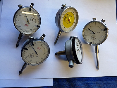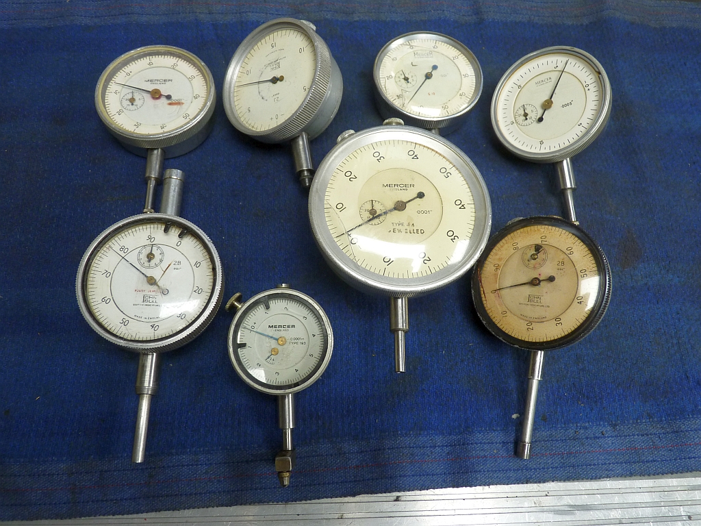 I've been adding to the collection of dial indicators again. I must have about 30 of them now! I've just picked up a couple of batches of Ebay. The first batch consisted of eight indicators including some nice 0.0001" and 0.0005" ones, all of them either Mercer or John Bull. One of the tenths indicators is a very nice Mercer with a three inch dial. It's just missing the screw in tip but I've got plenty of those now. All of these eight indicators work fine and just need a bit of cleaning up. The three inch Mercer was worth far more than I paid for the lot.