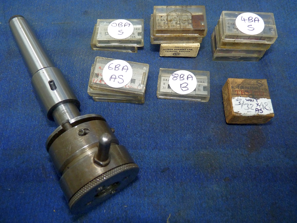 It came with an adapter which was far too big to fit the tailstock chuck for either the ML7 or the Denham lathe but that was only held to the stub on the die head with a grubscrew so was easily removed. The stub on the diehead was still too big for the chucks so I modified a 2MT shank that I had bought some years ago but never used. The end of the shank is left soft so that you can machine it yourself so I just drilled and bored it to take the stub. It was then drilled and tapped for a grubscrew again. The chasers come in different types to suit different materials e.g. type S is for steel, AS is for Stainless, etc. The manual for the die heads say that you must use the correct type for the material that you are threading but for the sort of use I'm going to put it to I'm sure that you can get away with using just one type. In any case, I do have various types in the chasers that I have got so far.