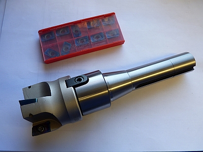 The facemill cost just over £25 complete with four Blue Nano inserts and the R8 arbour which is very cheap. The inserts were £15.80 for ten. The face mill itself and the arbour seem very nicely machined and the inserts fitted perfectly. The Blue Nano inserts are supposed to be a lot tougher than standard carbide and should last three or four times longer before they need changing. Time will tell how good these actually are but the reviews seem very good.