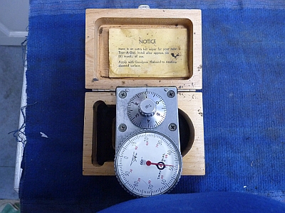 The large dial reads thousandths of an inch and the smaller one reads tenths of an inch. I haven't checked but I bet that you can zero the tenth dial the same as you can the thousandths dial. The ones I had seen for sale were very expensive e.g. there is one on Ebay now for £250 but this one had a starting price of only £25. I didn't expect to get it but no one else bid so I got it for £25. Bargain! The seller is probably a bit sick as I'm sure he would be expecting to get a lot more than that for it. It's in very good condition apart from a crack in the crystal and came with the original wooden case and a new spare wiper felt for the side that goes against the bed and keeps the chips away from the driving wheel. It will be more useful on the Denham lathe than the ML7 but will need some sort of adapter to mount it. The body has a dovetail on the back so I will have to make something to fit that.