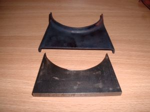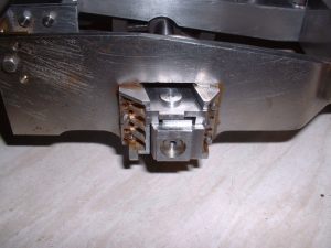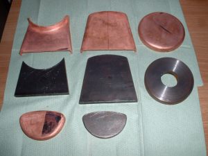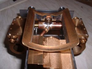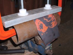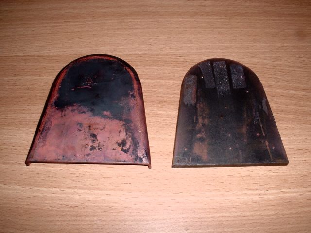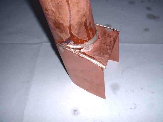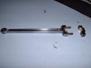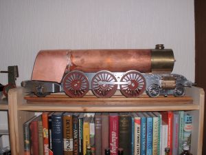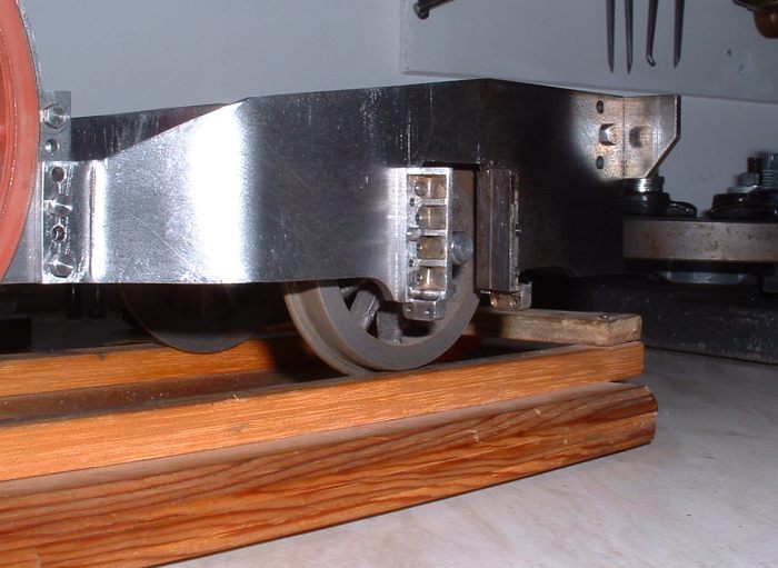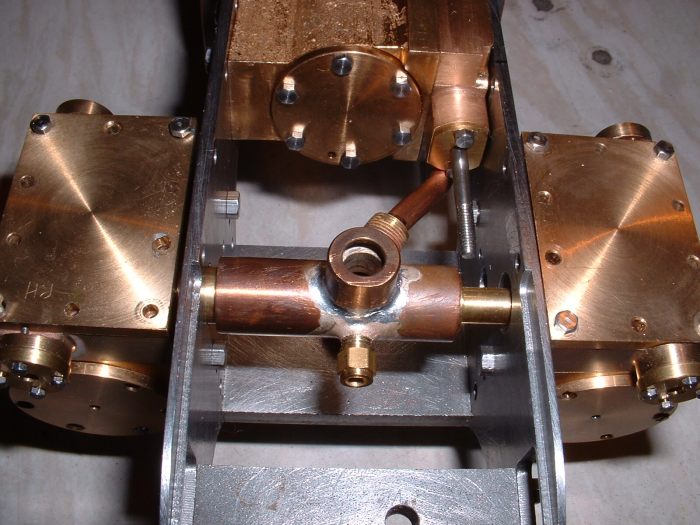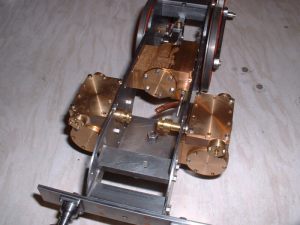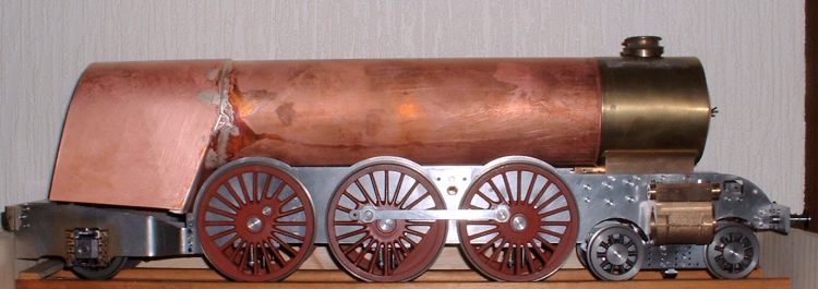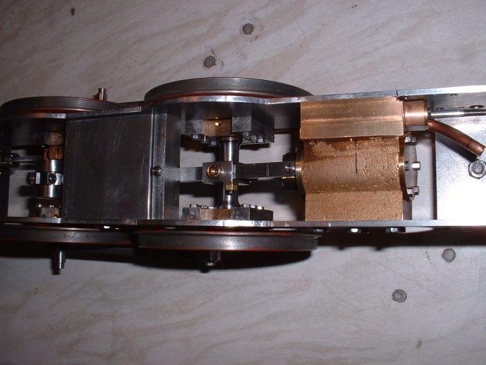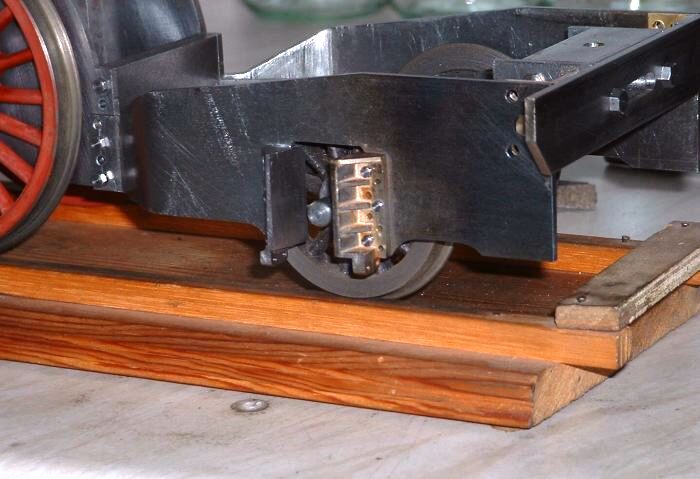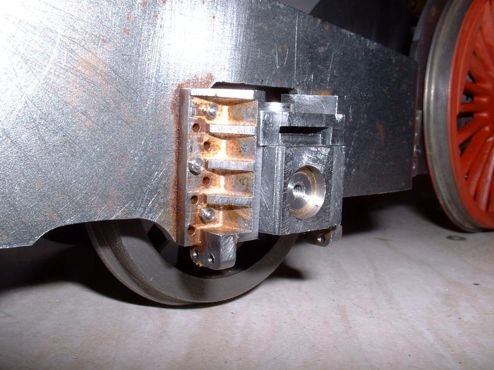 3 The inside connecting rod was tackled next and machined from 1/4" mild steel flat. The edges were milled in the lathe like the coupling rods and the small end rounded by filing using hardened steel buttons as a guide. By this time I had acquired some woodruff cutters and the sides of the rod were fluted using one of these with the corners rounded off to give the correct profile to the bottom and ends of the flutes. The big end shells and the small end bush were machined from phosphor bronze bar. Custom made 5BA bolts were turned to bolt the big end cap to the connecting rod. These were made a good fit through reamed holes in the cap and the rod thus ensuring accurate alignment on assembly. Completed inside connecting rod The complete middle cylinder was fitted into place and I breathed a sigh of relief when everything seemed to line up ok and the crank axle still went round when the big end bolts were tightened up! Middle cylinder and connecting rod fitted in place A return was then made to the outside cylinders. The valve chests were cleaned up and the front bosses machined to take the extended valve spindle and O ring seal. New steam inlet stubs had to be turned as the layout of the steam manifold is different for the three cylinder version. The steam manifold itself was turned from bronze bar and the oil pipe connection, middle cylinder steam connection, and the main steam inlet connection were turned separately and silver soldered in. I had a slight problem here as I had turned the main steam connection from a piece of aluminium bronze and this didn't seem to want to take the silver solder properly. I eventually ran some soft solder over the joint to make sure it wouldn't leak. I learnt afterwards that some ordinary salt should be added to the flux mixture when soldering aluminium bronze to help clean the metal. I think this idea of fitting all the steam connections with O ring seals and push fitting them together is a much better idea than using fiddly bits of threaded pipe that are a nightmare to put together and take apart again! I'm sure that O rings could be used instead of olives on pipe connections. Outer cylinders fitted temporarily to check fitting of steam manifold New steam manifold I thought I'd fit the saddle next as I knew that part of the rear base had to be removed to clear the middle cylinder. I wasn't very chuffed when I realised just how much had to be removed! Also a recess had to be filed in the front of the saddle to clear the steam inlet for the manifold. It was a bit of a tight squeeze to get it to fit. Fitting the saddle At this point I thought it was time to finish the chassis off by adding the rear subframe and trailing axle. Unfortunately I had another attack of 'scale-itus' and decided to fit a proper Cartazzi trailing axle. I had previously obtained a set of Don Young's Locomotives Large and Small (an excellent magazine which ceased publication on Don's untimely death) and one of the locos described therein was Doncaster, a 5" gauge A1/A3. The loco is a highly detailed and accurate model which was designed using the original works drawings. To make life easier I just copied the 5" version of the horns and axleboxes at half the original size. In fact If I were starting again with this project I think I would have used this design redrawn to 2 1/2" gauge. Too late now though! The subframes are basically the same as the version in Model Engineer but the horn slots are slightly larger to accept the Cartazzi horns. They were bent up cold from 3/32" mild steel but I would recommend anyone to heat the steel before bending as it's quite difficult to get nice sharp bends when bending the steel cold. It would also be better not to cut out the horn slots until the frames had been bent. Anyway they turned out ok the way I did it. Obviously there are no castings available for the Cartazzi horns so the only alternative was to fabricate them. I used mild steel but could have used brass I suppose. Each horn was built up in two pieces silver soldered together. The main piece consists of the flange that bolts to the frame and has the ribs milled into it. This was machined from 3/8" square. The actual angled bearing face is a piece of 1/16" flat silver soldered on after the angle (17 degrees) had been milled on the ribs. The horns are fastened to the frames with 8 10BA nuts and bolts. The work involved was very fiddly and time consuming but the result was well worth it. The built-up Cartazzi horns The axleboxes themselves are machined from 3/4" mild steel and are fitted with bronze bushes. A shoulder on the axle and a disc bolted to the end of the axle ensures that the axle box moves sideways with the axle as the loco negotiates the curves. The spring plate was also turned and milled from 3/4" square steel bar. This was a particularly fiddly job! Side control is probably unnecessary in this size so the wedges which provide this on the full size loco were omitted. The whole assembly is complicated enough as it is! On assembly some 'fitting' of the axleboxes to the horns was necessary so that the axle assembly moved freely from side to side without jamming. In theory the bearing surfaces of the horns and axleboxes should be slightly curved but its easier to make them straight and allow a generous clearance. The trailing axle is not going to do a great deal in this scale so precision fits are not really necessary. Axleboxes and spring plates fitted That about brings construction so far up to date. I'm working on Helen Longish at the moment but will try to progress the Scotsman at the same time. Watch this space! 25/08/2006 It's been a while since I did any work on the A1 due to working flat out on Helen. However, as mentioned in the Helen write up, I want to take Helen's boiler and this one to Chesterfield on October 1st for a preliminary inspection prior to installing the fireboxes etc into the boiler shells. So I have started work on this boiler as well. The A1 boiler, al