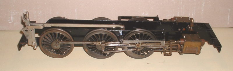 This chassis was again bought off Ebay but turned out to be one of my better acquisitions as it's very well made apart from a touch of 'wobbly wheel'. The valve gear is especially well made. I can't trace it to any published design so I assume it is freelance. If anyone out there can put a name to it I'll be very grateful. The unusual shape of the expansion link brackets may help identify it? Driving and coupled wheels are 3-1/2" dia. with spacings of 4" and 4-5/8". Cylinders are 1-1/8" stroke by 13/16" bore with Walschaerts valve gear. Overall length of the frames is 20-3/4".