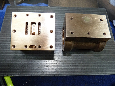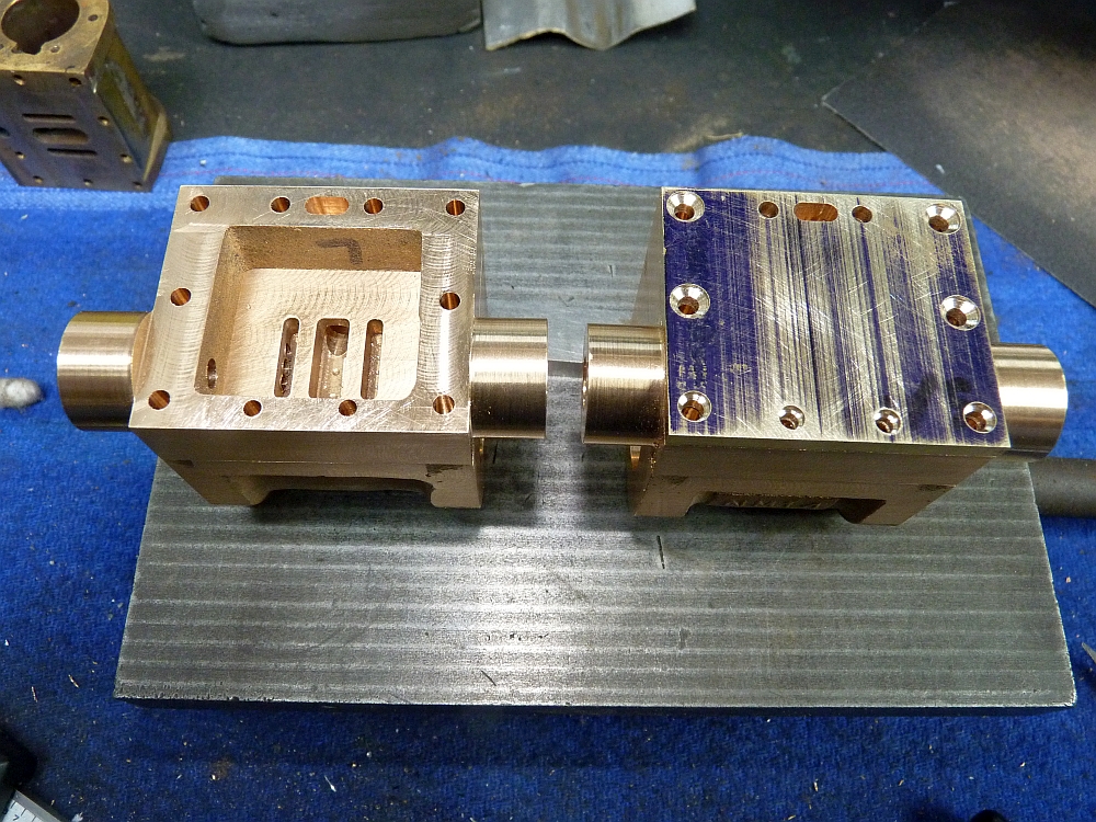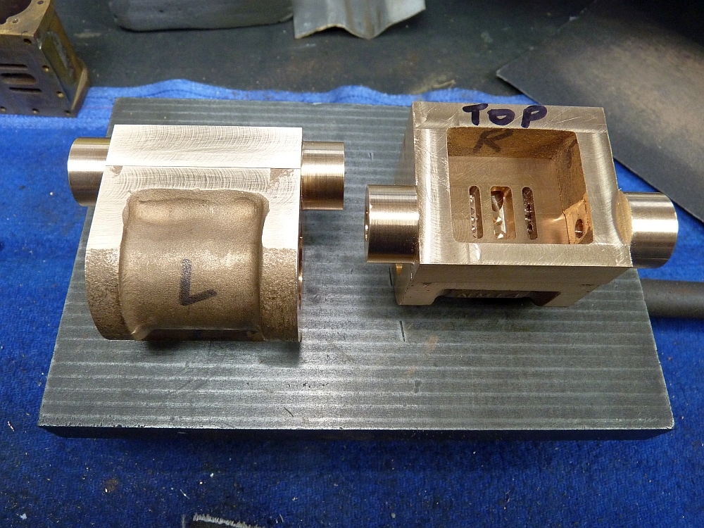 Because I was cutting to the exact length of the steam chest I got a very thin wafer of metal left on the edges but it just broke off very easily. You have to be very careful when machining gunmetal though as it leaves razor sharp edges on any machined surfaces. It's very easy to cut yourself. One reason I don't like the stuff as well as it machines like cheese unless you use really sharp cutters! Now it's a case of turning the casting over and machining the other face, then repeating this on the second casting. It seems to be taking forever to do these cylinders! 15/05/2020 The rest of the machining went smoothly so apart from drilling the holes the machining on the steam chests is complete and they fit like a glove.