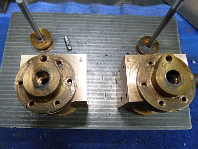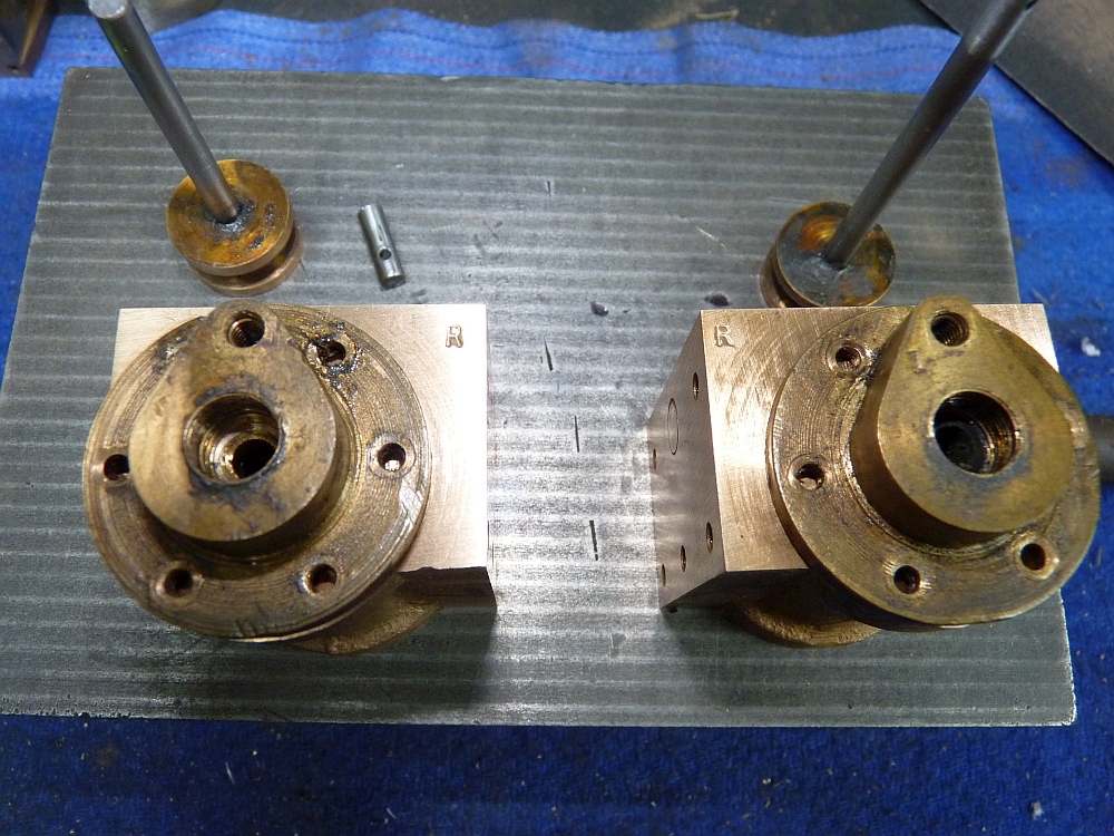 I really should have milled the ports a bit deeper to get rid of those dimples in the bottom from the drilling operation. I'm leaving well alone though! What next? Well, I need to see if the cylinder end covers will fit so that they can be reused. I removed the pistons, rods and gland nuts from the end covers as I had left the crossheads and slidebars etc. all in one piece. The crossheads were retained on the rods by a taper pin so removal was just a matter of tapping that out. When I came to disassemble the lefthand assembly though I couldn't get the gland nut off the end of the piston rod. I thought it was just a burr on the rod to begin with but closer inspection showed that the end of the piston rod was bent. As the rods were going to be replaced anyway I just sawed the bent end off rather than try and straighten it. I then tried both the left and right rear covers in the cylinder bores and the spigots on both are about 2 thousandths of an inch too big. The original bores are obviously slightly bigger than the new ones. Oh well, it's better than the cover spigots being too small. The problem now is how to remachine the covers to remove such a small amount and keepng the spigot concentric with the bore for the piston rod. The outside edges of the covers could also do with a bit of a clean up at the same time.