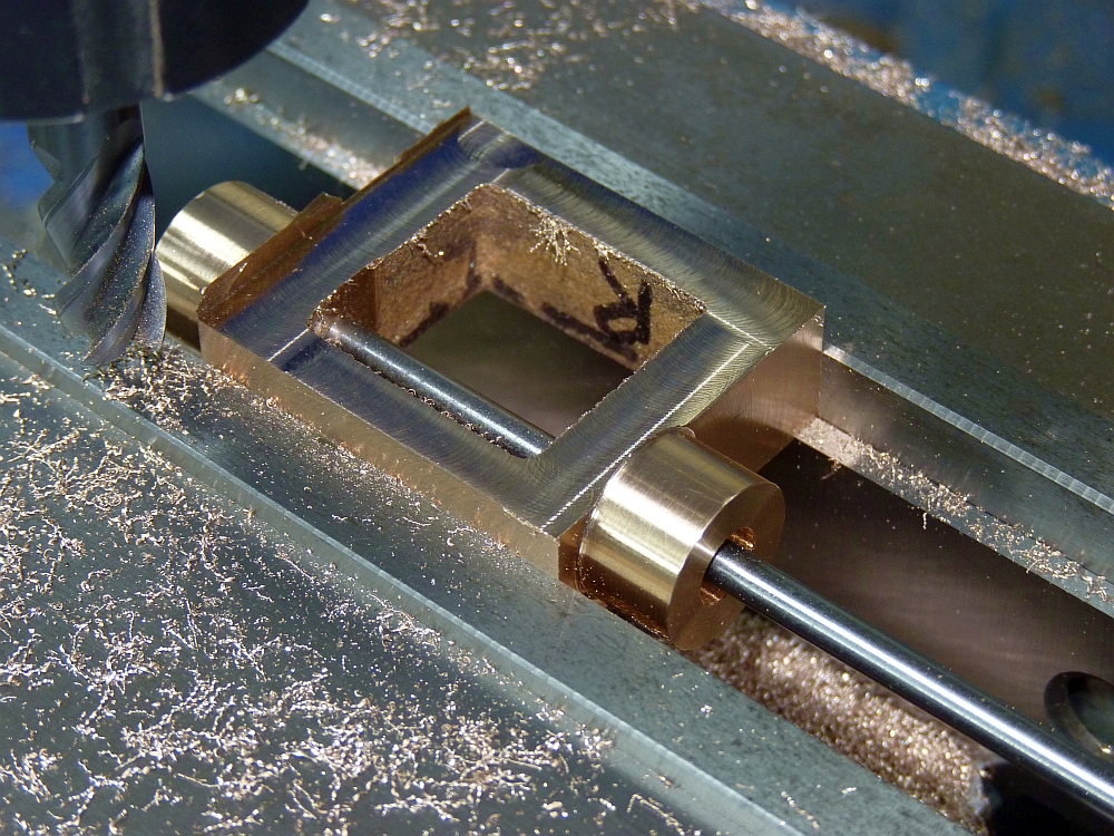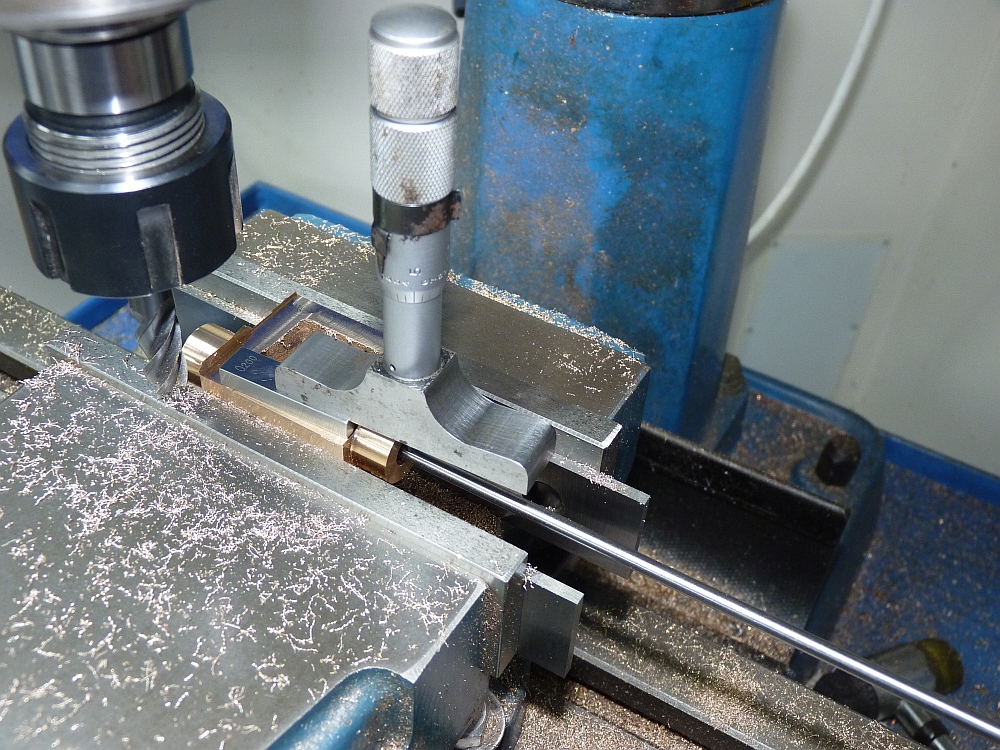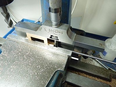 This depth mic needs a bit of restoring but it works fine. The top part of the thimble that you unscrew to change the rods was seized solid when I got it from Ebay but I soaked it in very thin oil and it came loose eventually with help from a bit of heat. It came with all the rods but no case and didn't cost very much. I used the DRO to set the width between the bosses by centreing between the ends of the casting and then calculating how far to go in each direction to bring the width to size, allowing for the diameter of the 10mm endmill that I used. Actually, I had to increase the width cut slightly from that calculated as I think the cutter is a reground one so is undersize.