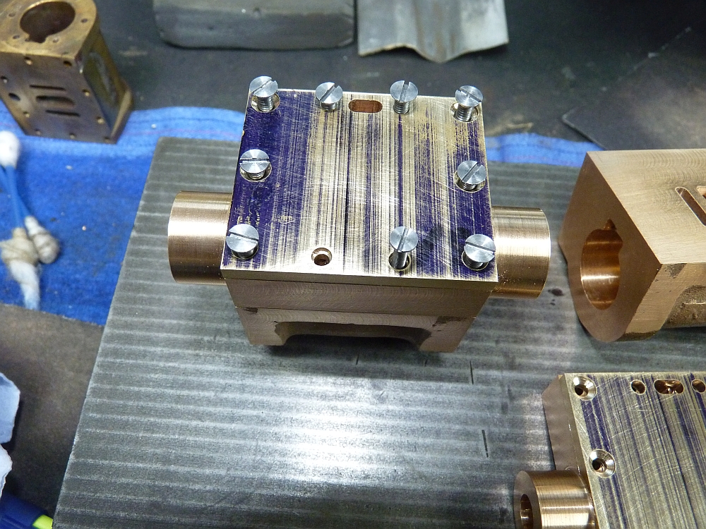 I also milled the exhaust passage but this will have to be revisited once I've fitted the blanking plugs in the cylinder bolting face as they will block off the milled passage when fitted and the passage will have to be milled through into them. After I had drilled and tapped the first cylinder I tried fitting the steam chest and cover to see if the holes lined up! All but one of the 8BA's went in perfectly. I think the hole for that one wandered a bit in the steam chest. The drill I was using wasn't the best.