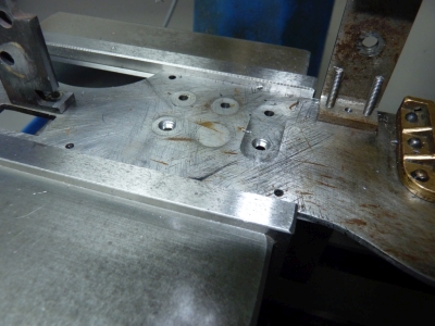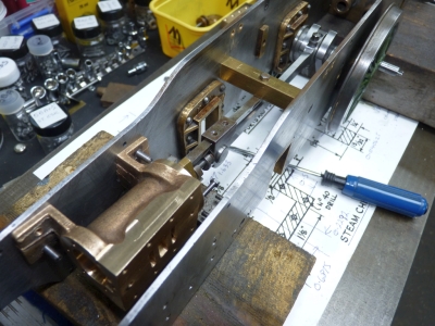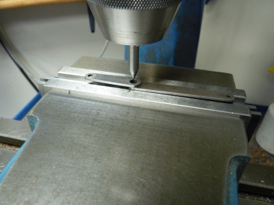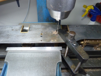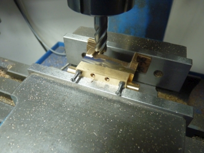 I should mention that the axle boxes on the driving axle had been set to running height by putting a spacer (a 5BA nut!) inbetween the bottom of the axlebox and the hornstay before I checked the clearance between the rod and the slidebar. If it does hit when the axle boxes are at the top of the horns (unlikely to happen) then I can increase the chamfer on the end of the slidebar a bit if necessary. 04/01/2021 Now that the cylinders are nearly finished it's time to have a look at the 2 to 1 levers that drive the middle cylinder valve from the outside ones. Firstly though, I had to countersink the top two fixing holes for the outside cylinders on the inside of the frames. You can't fit bolts or studs here as they would foul the inside cylinder and valve chest so countersink head screws have to be used.