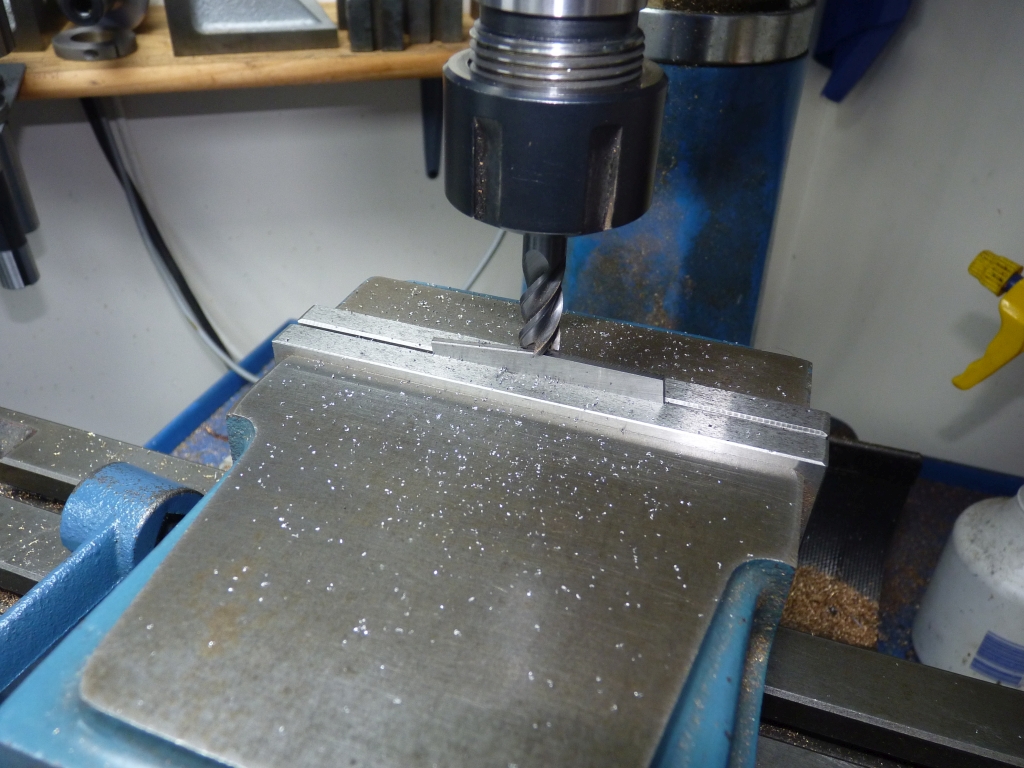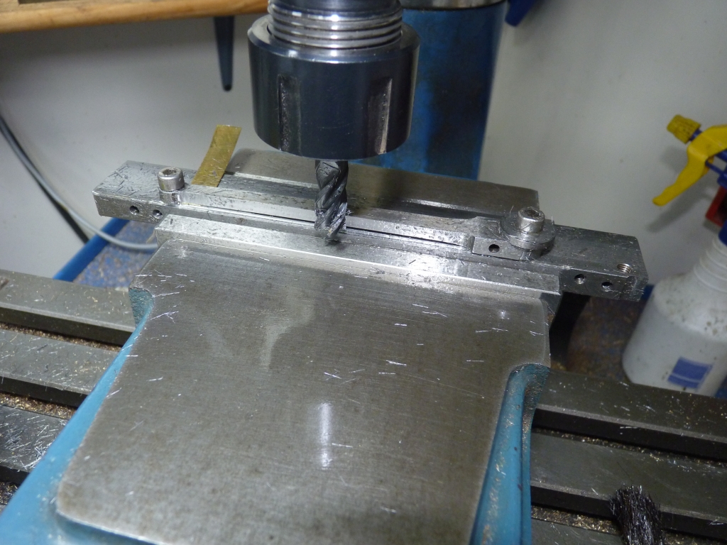 There was a chamfer on the end of the slidebar and I could have made that bigger but it would have reduced the thickness of the slidebar where the fixing bolt is threaded in. Instead, I chose to mill some off the top and bottom of the connecting rod to thin it down. It was thicker than shown on the drawings anyway so that was not going to be a problem. I could have just milled some off the top I suppose but that would have made it a bit asymmetrical, not that you would notice. I made a simple jig to hold the rod in the mill vice with the centreline of the rod at an angle to the x axis of the mill that matched the existing taper on the rod. The jig was just a length of steel bar that I had used before for a similar job with a 5mm bolt through the little end of the rod and the other end held with a 'top hat' shaped bit of bar to locate the big end of the rod and to clamp it down at the same time. One side was milled and then the rod turned over to do the other.