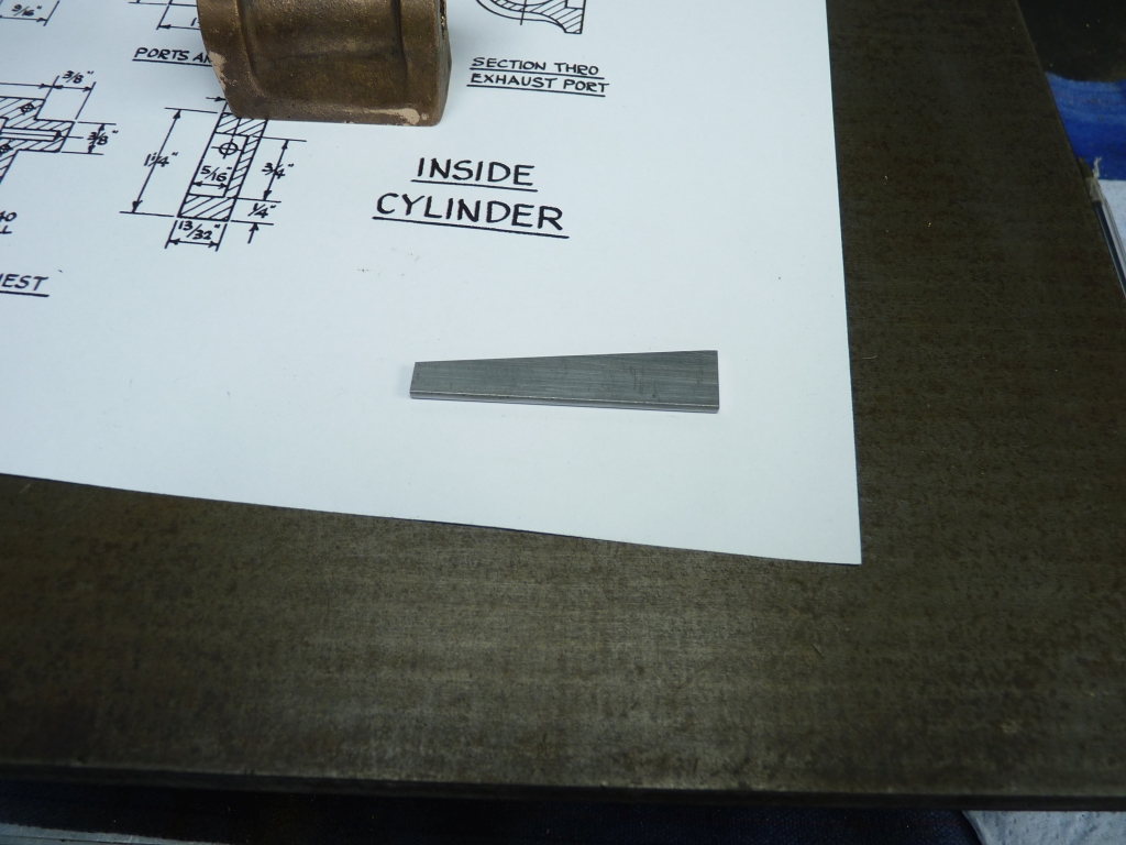 I was careful to take the bare minimum off the edges as the casting is undersize in the width before any machining was done so the steamchest will end up slightly narrower than on the drawings. I thought that it might be useful to make a 6° angle gauge. This should help when I'm setting up the casting in the lathe to machine the cylinder bore although I'm not sure yet how I'm going to do that. The gauge is just a piece of 1/16" thick steel flat. I clamped it in the vice with the top edge set at 6° to the bed, again using the Wixey angle gauge. That would be plenty accurate enough for this job. The top edge was then milled flat.