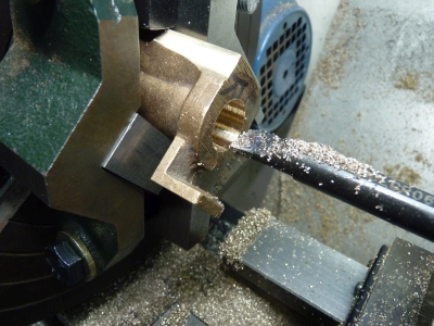 I had to be a bit 'creative' with holding the casting in place as I couldn't use the Vee in the normal clamping piece due to the mounting lugs on the casting getting in the way. The mill table clamp holds the edge of the port face firmly against the 6° angle gauge and the lump of steel between the casting and the clamp holds the portface against the face of the angle plate. Hopefully, it would be secure enough. I fitted the faceplate to the lathe and tapped the angle plate about until the machined register in the bore ran truly. I then went ahead and started to bore the cylinder.