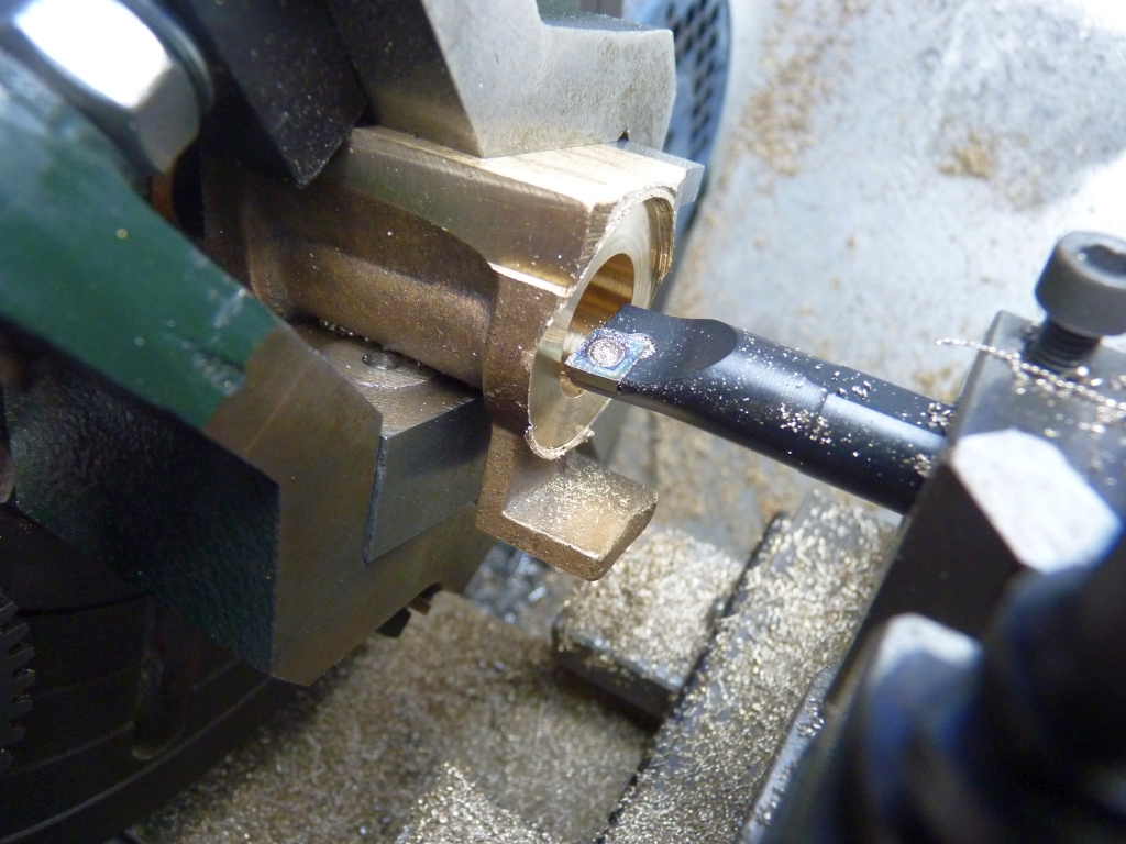 I used one of my carbide insert boring bars again as they seem to give quite a good finish on the gunmetal. I got to about 0.012" of finished size and then called it a night as it was getting late. I'll finish the bore to size tomorrow. I could do with setting up a power feed to the leadscrew again like I have done before as turning the leadscrew for boring using the handwheel on the end is quite tiring after a bit. One of these days I may have a go at building the electronic leadscrew project as described by Clough42 on YouTube. That would be heaven. No more messing about setting up changewheels! I suppose I ought to get the x axis table feed on the mill done first though. I've had all the bits for that for ages! 20/12/2020 Carrying on with the cylinder I finish bored it to size and then took a facing cut across the end to finish the cylinder to length after working out how much needed to come off each end.