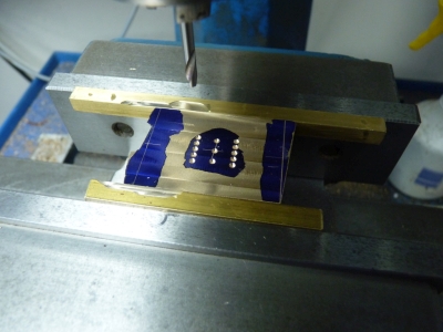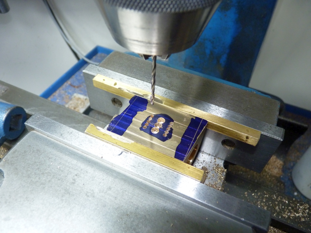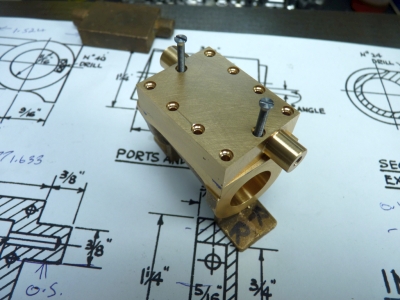 The steam chest is held on by 7BA countersink screws as the top is right up against the frames so the holes were countersunk as well. I managed to put a nice mark on the top of the steamchest by carelessly not raising the drill high enough when I moved from one hole to the next! I didn't notice it at the time as the top was covered in chips. A trial fit on the cylinder showed that all the holes lined up nicely.