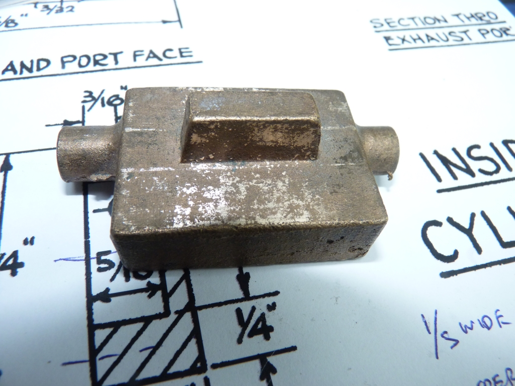 There's not a lot of depth for the ports this time as the port face is only about 0.25" from the bore so I played it safe and only made them 0.160" deep. Whilst the casting was set up like this I also drilled and tapped for the steam chest fixing bolts but I forgot to photograph that. I thought that I would move on to the steam chest next. This casting is only just wide enough and would finish up undersize by the time I had machined the sides. That shouldn't be a problem as the walls of the steam chest are plenty thick enough. The casting is a bit unusual in that it has the cover cast in rather than it being a separate piece. This particular casting also has a lug cast on it, presumably to make holding it for machining easier.