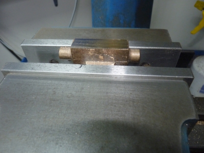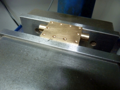 The next job will be to fit the rear cylinder cover along with the piston, crosshead and slidebar and trim the piston rod to length. There is also a small square stretcher that supports the end of the slidebar that will no doubt need to be repositioned and the holes for it in the frames moved to suit. 03/01/2021 The piston rod was trimmed to length using the same method as for the outside cylinders i.e. the cylinder was fitted with the piston, crosshead and slidebar and then the middle connecting rod installed and the length of the piston rod adjusted so that there was an equal gap at each end of the cylinder. I did have to fettle the slidebar first though. It was bent for a start and also wasn't parallel to the piston rod as the hole for the threaded stub on the slidebar that screws into the cylinder cover boss hadn't been drilled and tapped straight. I had to resort to a bit of brute force and bent the threaded stub until the slidebar lined up properly. This is another feature of a lot of LBSC designs that I don't particulary like - threading the end of the slidebar into the cylinder end cover. Everything needs to be spot on for the slidebar to line up correctly. I much prefer where the slidebar is bolted to a flat on the boss of the end cover as it's position can be adjusted with shims if necessary. The other end of the slidebar is bolted to a square stretcher to hold it securely and of course, the holes in the frames did not now line up with the stretcher. The original stretcher was only 0.25" square but I decided that if I made a new one of 0.375" square then I would be able to use the existing holes in the frames. I used a bit of square brass as I had some to hand and machined the ends square in the four jaw chuck in the lathe and trimmed it to a nice fit in the frames. It was then held in the correct position with a machinists clamp, the frames were put in the mill vice and the fixing holes spotted through from the frames.