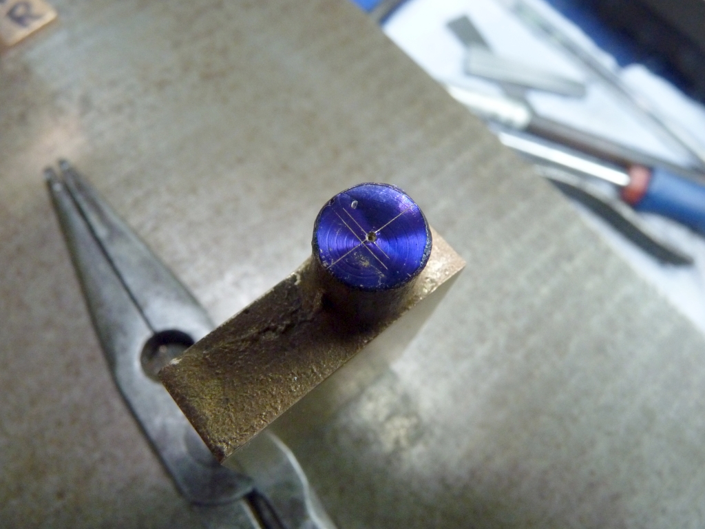 Prior to this I had printed out a drawing of each end of the cylinder showing the position of the ends of the passages relative to the centre of the bore so the next job was to centre the bore on the mill spindle using a DTI in the chuck. The bore appears slightly elliptical to the mill spindle due to the 7° angle but I just centred the x and y axis which was accurate enough. Using the DRO I could then find the exact position of the end of the passages ready for drilling. I first deeply spotted the passages with a 3mm spotting drill. The face of the cylinder is at a slight angle of course but the spotting drill is nice and stiff so wouldn't deflect.