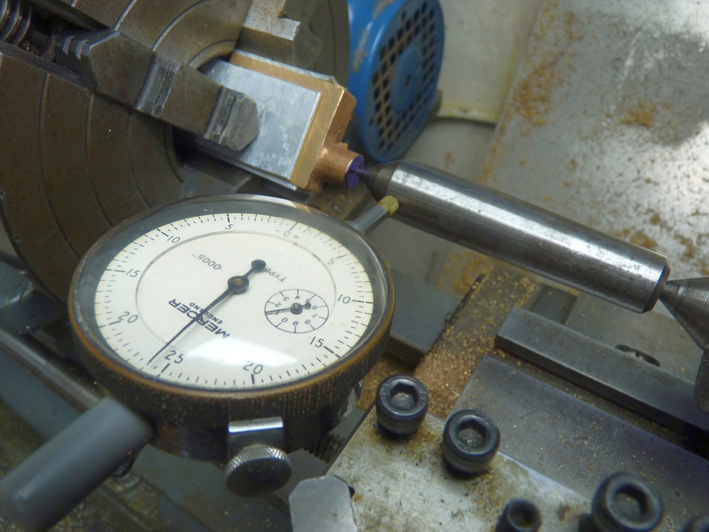 You'll notice that there are two lines scribed on the boss to mark the position of the valve spindle from the side of the valve chest. The 'non centre popped' one is the correct distance from the edge of the casting but this put the valve spindle way off centre of the boss so I moved it by 1/32" (0.3125") to move it more towards the centre. The valve chest is narrower than the port face on the cylinder so I can compensate for this by moving the valve chest further down the port face. The casting was then put back into the four jaw chuck and the centre pop on the end of the boss centred in the chuck using a method that I had never used before. I've seen it used many times before and involves using a lathe centre and a dial gauge. The point of the lathe centre is placed in the centre pop and the other end end of the centre held by another centre in the tailstock. Any errors in the position of the centre pop are easily seen on the dial gauge and the casting adjusted in the chuck until the centre runs true. The method works very well.