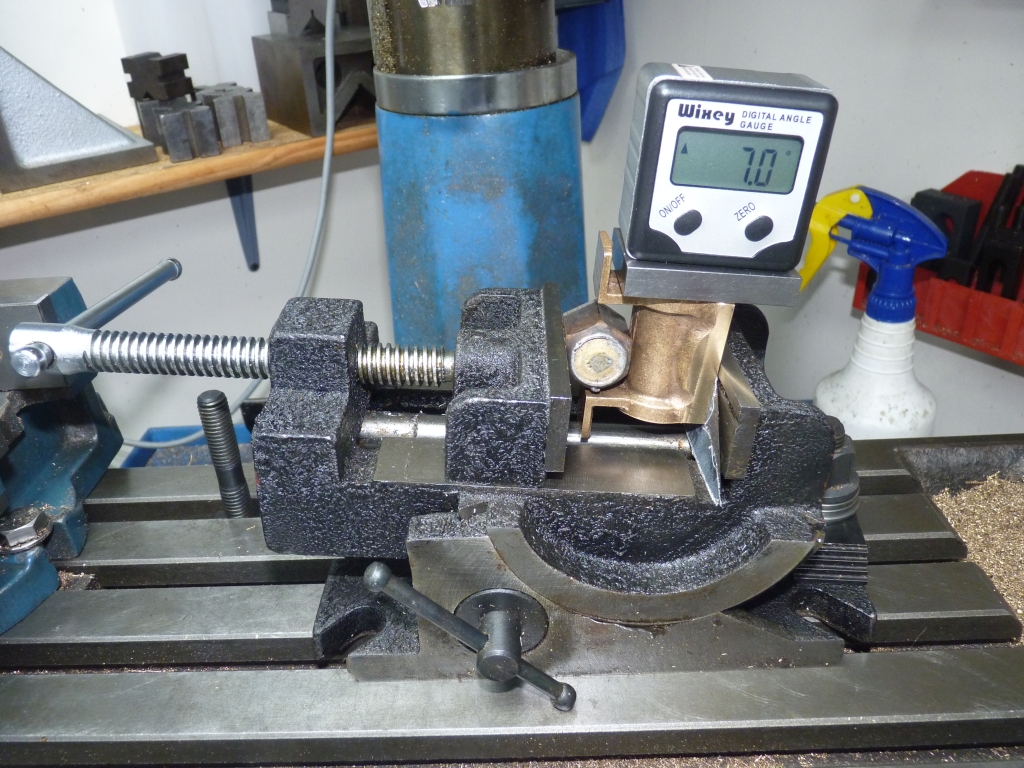 The problem now was how to hold the cylinder to drill the passages. I had worked out that the passages needed to be drilled at an angle of 7° to the bore so that they exited just above the bottom of the steam ports but couldn't think of an easy way to do this using the ordinary milling vice. Looking through my collection of vices I came across a tilting drill vice which solved the problem. I'd forgotten that I had got it. I think it was possibly an Ebay buy at some time. By clamping the cylinder in this vice I could bolt it to the mill table and then tilt it to the required 7°. I used the digital angle gauge to set that after squaring up the vice with the table.