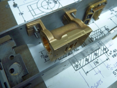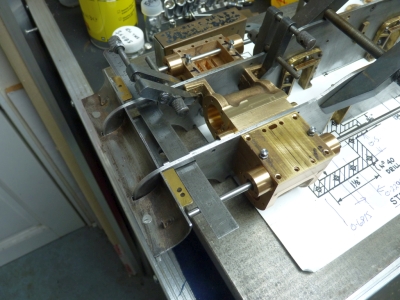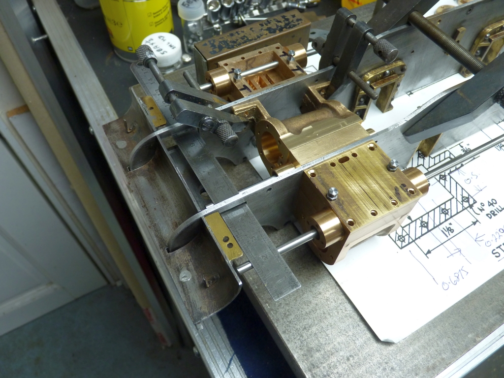 It was a bit fiddly to set up but with a bit of gentle tapping here and there I managed it. A couple of small machinists clamps were used to firmly hold the cylinder in place as I then had to dismantle the frames so that I could set the RH frame up in the mill, complete with the inside cylinder, and spot the holes in the lugs through to the frame plate.