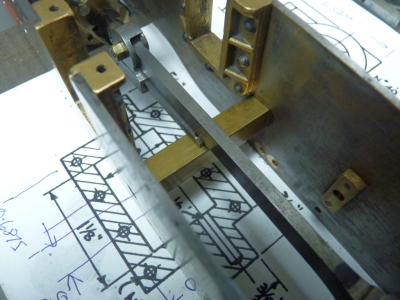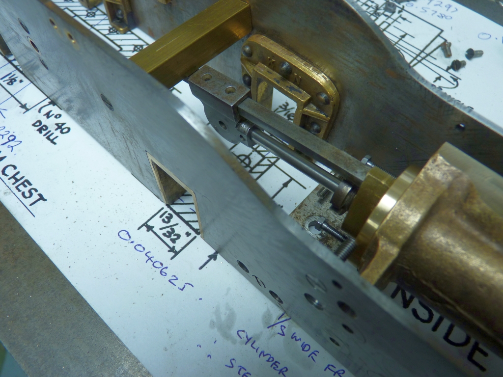 I didn't bother cleaning up the levers at this stage in case I had to scrap them and make new ones! The end of the long lever doesn't quite line up with the RH valve spindle vertically but I can adjust that by bending the levers slightly. They may well be bent anyway to line up with the old position of the valve spindle so may just want straightening out again. The short end of the long lever is nearly touching the top of the clearance slot in the frames so that needs a bit more filing out.