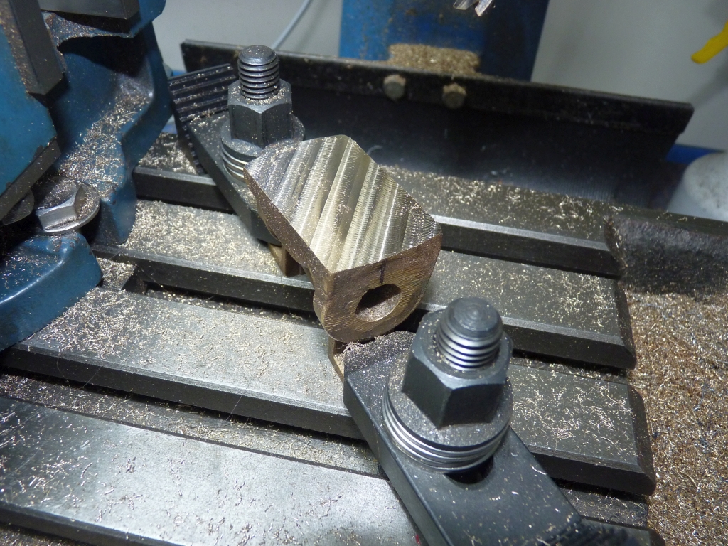 The easiest way to mill the port face seemed to be to clamp the casting to the mill table by the now machined lugs. I had to have the casting at an angle to get the clamps in.