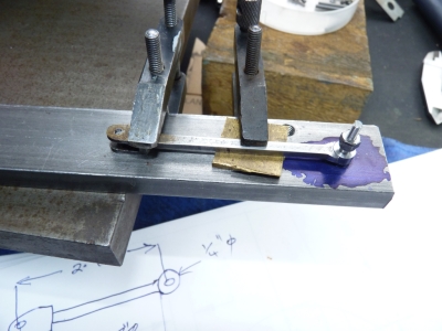 The small vice is one I use clamped in the bench vice and is great for holding small components. I just clamped it to the bed of the mill with a couple of strap clamps. I made another jig to hold the rod and the new endpiece in alignment whilst I silver soldered them together. The blue on the steel base was a mask in an attempt to stop me soldering everything together!