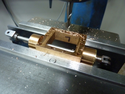 I used a small 60° centre in the drill chuck to find the centres of the driving axle, the weighshaft and the expansion link bearing. It wouldn't be 100% accurate but it would be close enough for what I wanted to do. I did the same for both sides of the frames. The weighshaft was within 0.020" between the positions on both frames but the distance between the expansion link bearing and the driving axle was 0.060" shorter on the lefthand side than on the righthand side. That meant the motion bracket was still in the wrong position even though I thought I had sorted it ages ago! I'm going to have to move it again. Whilst I was at it, I measured the throw of the return cranks and also the length of the eccentric rods. The return cranks were set to exactly the same radius which was good news. The actual measurements that I got are quite different to what they should be according to the drawings but so long as I know what they are that's fine. I transferred the measurements I had taken to a CAD drawing and then worked out the dimensions needed to go into the Wallace simulator. The results were not good and showed that the eccentric rods were too short. Taking the righthand side as an example, the eccentric rod was 2.412" long but it needs to be 2.490" long, a difference of about 0.080". That may not seem a huge difference but it's enough to completely mess the valve events up. You can set the valve so that it will run in full forward gear and maybe the next notch back but the valve events in reverse are totally wrong. That's exactly what I found when trying to run the chassis on air. The lefthand side is different because of the different position of the expansion link. To get that to run correctly the eccentric rod would need to be 2.440" long. So, I am going to have to 'adjust' the length of the eccentric rods somehow. I don't really fancy having to make new ones from scratch so I'll see if it's possible to extend the original ones somehow. What I did today though was strip the lefthand frame off the chassis and move the motion bracket so that it's more or less in the same position as the righthand one. At least then I can make both eccentric rods the same instead of having two different lengths. 20/02/2021 I decided to modify the existing eccentric rods, at least for the time being, but I may replace them at some point in the future. At the moment I just want to prove that the rods being the wrong length is indeed the problem with the reverse running. The easiest way to lengthen them seemed to be to cut the very end of the return crank end off and solder a new piece on made from a 0.125" slice of 0.25" steel bar. So, the end of the existing rods were cut off roughly with a saw and then mounted in the mill and the end trued up with a 0.25" endmill. I used the DRO to measure the distance between the centre of the endmill and the expansion link fork on the rod (2.490" as calculated from the simulator) and then the end of the rod was trued up by plunging down with the endmill which left a scalloped end that fitted the piece of 0.25" rod nicely and gave a good area for silver solder.