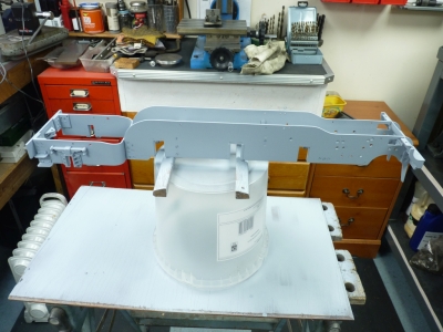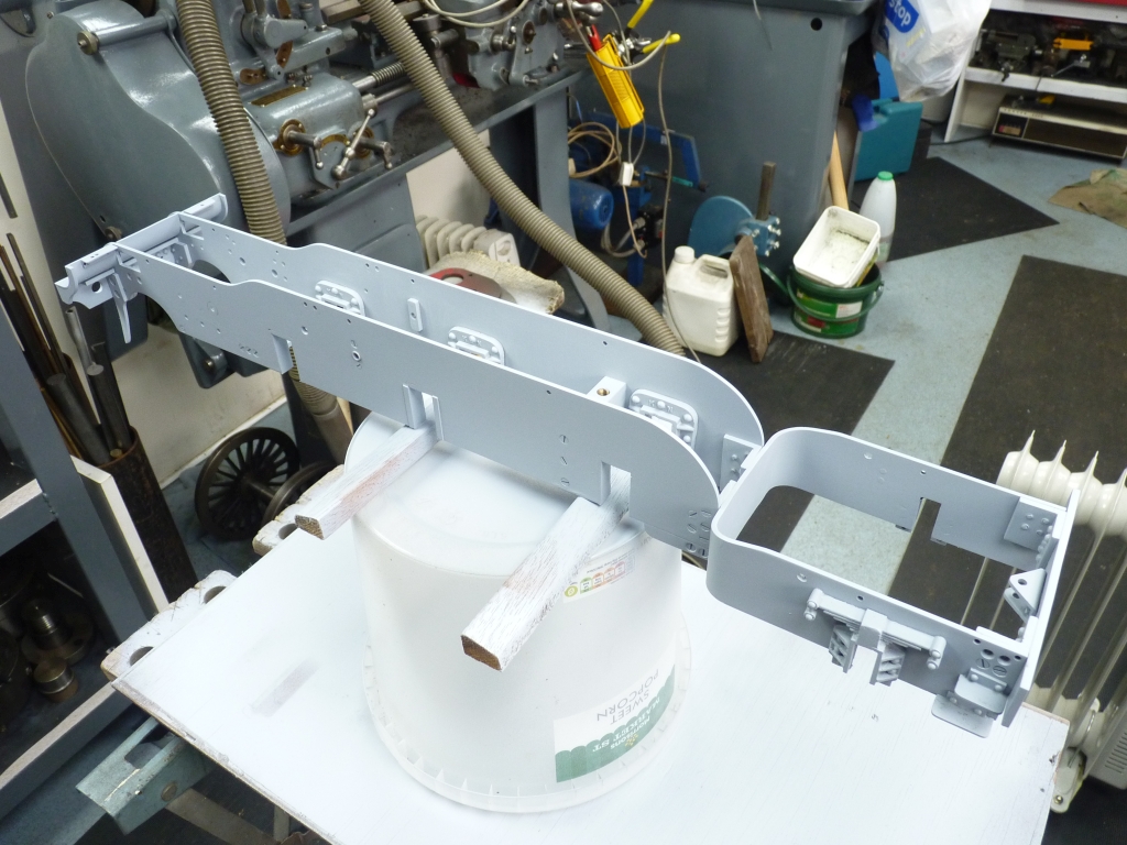 It only seems to be the driving wheels that have this excess clearance, the coupled wheels are ok. I could now move on to final cleaning up of the frames so that they could be painted. Everything was first washed down with brake cleaner to get the worst of the oil off and then cleaned up to remove any traces of rust and old paint. I then went round all the countersunk holes checking that the countersinks were deep enough to take the screw heads and deepened where necessary. All the frame components were next washed with POR15 Metal Prep (Marine Clean) which is an organic degreaser which works very well. It leaves steel so clean that it will flash rust if you do not dry it quickly. The parts were then treated with POR15 Metal Ready which is basically a phosphoric acid rust treatment that leaves the steel coated with zinc phosphate which helps to prevent future rust. I decided that it would be easier to etch prime the inside faces of the frames and the various stretchers prior to assembling the frames again. The outside would be done once the frames were back together. I used a spray can of Upol Acid 8 etch primer which is my 'go to' primer for this sort of job. It's very easy to put the primer on far too thick using the rattle cans so you have to be careful. I do tend to get better results using the airbrush as it's easier to control how much goes on but I'd bought the rattle cans so used them. At least you don't have to spend ages cleaning the airbrush afterwards! Once the primer was dry I reassembled the frames using all new screws with Loctite 242 threadlocker. I then realised that I was a stretcher missing. This goes at the bottom front of the frames and acts as a support for the front pony truck frame. I'm sure it was there when I initially stripped the frames as I remember that the securing screws wouldn't tighten down properly and it was loose. I don't know where it's gone but no doubt it will turn up when I'm not looking for it! Anyway, I made a new one from 0.3125" square brass and fitted that. Once the frames were back together I sprayed the outside of the frames and the front buffer beam etc.