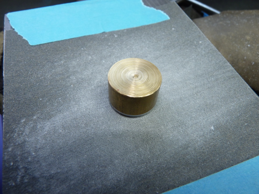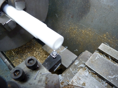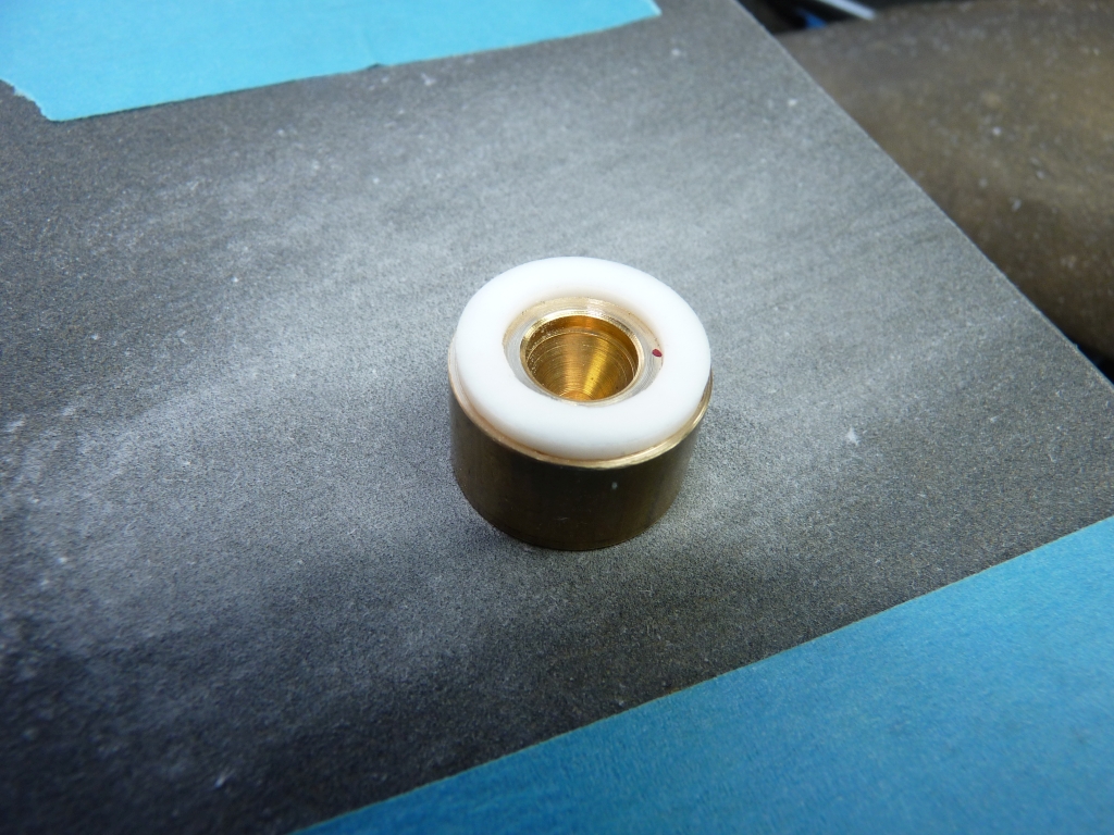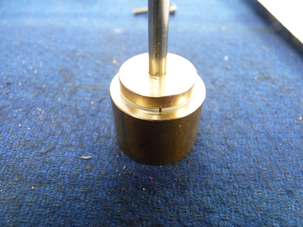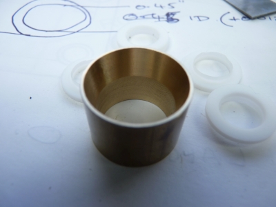 I could have done with less stick out from the chuck but I don't like chopping bars into short lengths as you always seem to waste part of it when it becomes too short to hold. Incidently, I've been meaning to try some of the polished carbide inserts that are meant for machining aluminium but can be used for brass and other non ferrous metals. Other model engineers swear by them. I've now got a couple and I'm quite impressed so far. They seem to cut brass very well and leave a good finish. I used one in the boring bar to bore the PTFE and one in the tool to machine the outside of the PTFE and the finish was excellent. Apparently, they cut mild steel quite well as well so I'll have to give them a try on that. I parted off eight rings at about 0.065"to 0.066" thick (six for the three pistons and two spares incase I messed up!) The rings needed to fit into the 0.125" wide piston groove so this left some for finishing the width of the rings by rubbing them on emery paper. To make it easier to hold the rings for finishing I found a scrap of brass bar that already had a spigot on it and turned the spigot so that the rings would just fit over it.