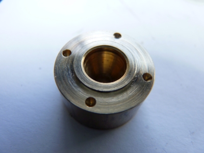 It was when I tried to fit the first piston and rings into the cylinder bore that I found out that it wouldn't go in! I realised that I had made the bore of the rings too small and the bore of the rings were touching the bottom of the piston slot before they could be compressed enough to fit into the bore. Oh x%&*! I couldn't enlarge the bores now as the rings were too thin to hold so rather than scrap them I did the next best thing and chucked the pistons in the lathe and took another 0.005" off the bottom of the piston groove! It was a right pain trying to fit the pistons into the bores with the rings on them. You had to hold the piston in the end of the bore and then try and push the rings into the groove until they would slide into the bore. Very fiddly, especially with the recesses for the steam passages in the end of the cylinder. 'I need a piston ring compressor' I thought so I made one from another scrap of brass bar. It's just a ring with the bore the same size as the cylinder bore and a long taper machined in one end to compress the rings as you push the piston in.