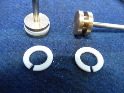 The valves were done so onto the piston rings. These are my pet design using two split rings side by side in the groove with the joints at 180° to each other. They've been working perfectly on Helen so that's good enough for me. The PTFE bar was chucked in the lathe, faced off, drilled and bored and then the outside turned to diameter. The bore of the cylinders is 0.6875" so I made the outside of the bar 0.70" so the rings would be compressed when fitted into the bore. I bored the bar to 0.450" to give some clearance on the bottom of the piston slot which was 0.4375" diameter (I should have gone back and read my notes on Helen as I later found that I hadn't left enough clearance in the bore!)