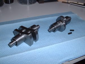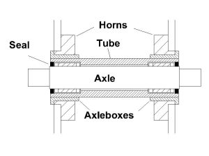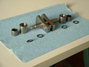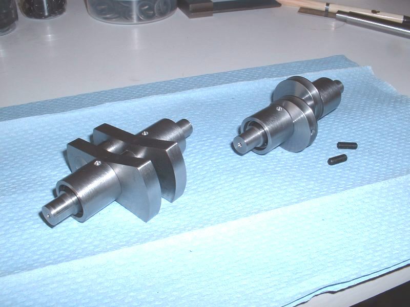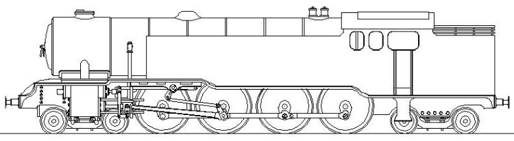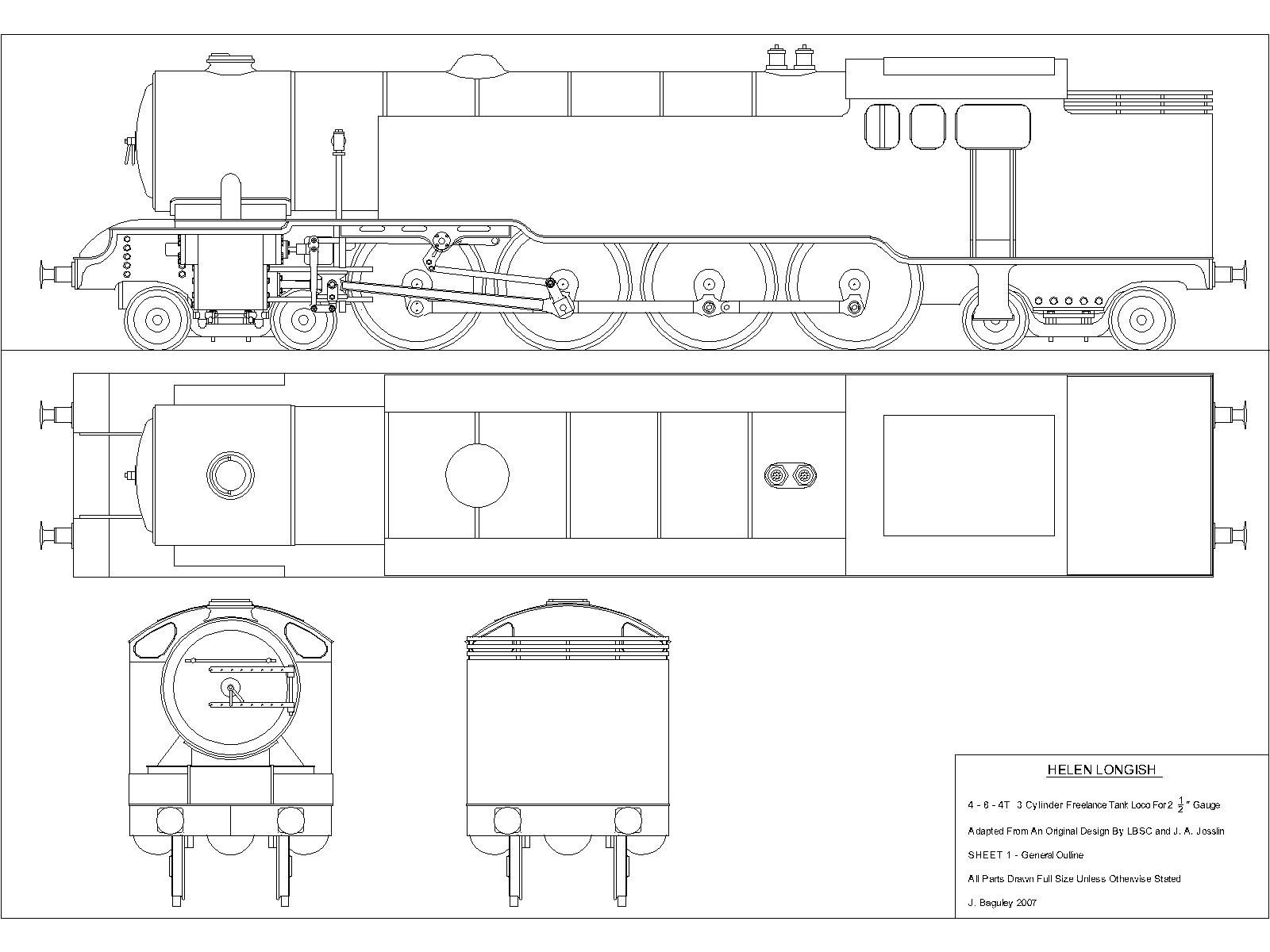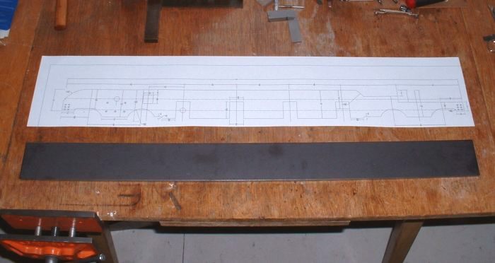 The next job to be tackled was the axles and axleboxes. I had already decided to use drawn cup needle roller bearings on all axles so looked around for a suitable supplier. I use RS quite a lot for electronic components etc. and found that they sell suitable bearings but only in metric sizes, not that that really matters. I decided to use 10mm bore bearings for the main axles and 8mm bore for the bogie axles and 8 of each were ordered along with some lengths of 10mm and 8mm silver steel. The three rear axles are simply lengths of 10mm silver steel turned down at each end to 5/16" dia. to a tight fit in the wheel bores. These were turned by holding the silver steel rod in a split bush bored in the 3 jaw to ensure the wheel seats were concentric to the main axle surface. My 3 jaw chuck does not hold bar stock accurately enough when gripped directly in the jaws. I will probably use Loctite for eventually securing the wheels in place on the axles. The crank axle is a built up job with 1/4" mild steel webs. I used Loctite 638 to 'stick' it all together and put 2 1/16" taper pins through each web into the axle for added security. I decided to leave the axle in one piece for the time being in case I decide to press fit the wheels instead of using Loctite. The centre of the axle between the crank webs will be removed after the wheels etc. are fitted. I found an article in Model Engineer by Phil Bevan (Vol. 158, No. 3792) on making simple Cannon type axleboxes for 5" gauge locos and decided to make mine along similar lines. The principal behind Cannon axleboxes is that the axle is fully enclosed inside a solid axlebox which goes the full width of the frames, thus protecting the bearings from ingress of dirt, grit etc. I thought this would be ideal for Helen's 2 rear axles as they pass under the firebox and the bearings would be exposed to ash etc. The 2 front axles cannot have a continuous axlebox across the frames due to the crank for the centre cylinder and the 2 eccentrics for the 2 axle driven pumps being in the way. Instead the axleboxes will extend as far as the crank and eccentrics and have seals both ends to keep out dirt. I thought about turning the axleboxes out of square steel bar of a suitable size to fit the horns but eventually decided to build them up using round bar for the actual axle 'tubes' and loctiting these into conventional type axleboxes milled from rectangular steel bar. The 'tubes' are drilled through with a hole to clear the diameter of the axles and each end bored out to take the needle roller bearings. Anybody thinking of using these drawn cup needle roller bearings should note that they must be force fitted into a housing several thou undersize so that the bearings are compressed. If this is not done, the axles will be a very sloppy fit! Drawing of proposed full width axlebox The two full width tubes were made from 11/16" dia. mild steel and drilled and bored in the 3 jaw chuck to take the bearings. The bearings are recessed into the ends of the tubes so that seals can be fitted on the outside. The tubes for the front axles are similar but shorter so that the inside ends butt up against the crank webs and the pump eccentrics. They are bored on the inside end to take an 'O' ring seal. Crank axle with bearing tubes, seals, and bearings The 2 pump eccentrics were simple turning jobs from 1" dia. mild steel bar, the groove being turned with a parting tool set square to the lathe axis and the embryo eccentrics parted off. They were then held in a split bush for skimming the parted off face. The eccentrics and bush were then transferred to the 4 jaw and offset by 3/16" to bore the hole for the axle. Boring eccentrics in the 4 jaw Crank axle, eccentrics and bearing assemblies I haven't any suitable material in stock for making the axleboxes so will order some after Xmas. The drawings for the loco are being done as I go along so the final details of the frames, such as positions of all fixing holes etc. won't be known until the chassis is complete. I am still working out the design for the cylinders which I'm hoping to fabricate from cored gunmetal bar and brass sheet. The outline for the frames has been decided on though so I printed out a full size dimensioned drawing to work from. The frame steel came from Reeves and I chose 3mm thick as they didn't stock a long enough size in 2.5mm and I couldn't be bothered to get a piece specially cut! I think the extra thickness will give the frames a bit more strength as they are not very deep (2-1/4") for their length (28") and the horn slots will be quite deep. Also the rear section of the frames over the trailing bogie is quite flimsy. I think a substantial stretcher will be needed here to stiffen it up. Incidently, the frame drawing, which was printed out on a HP Designjet 250C, is absolutely spot on to the correct size.