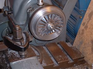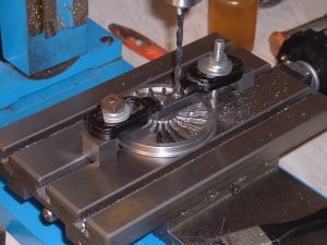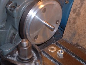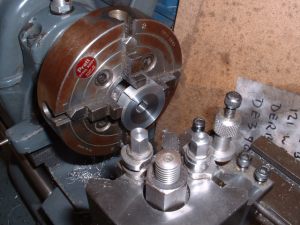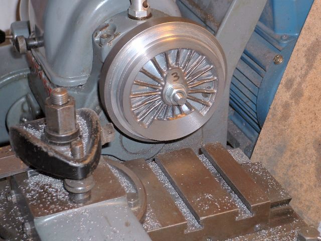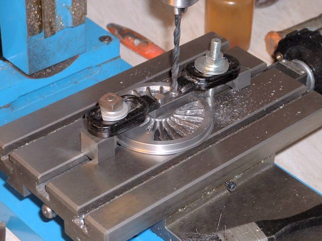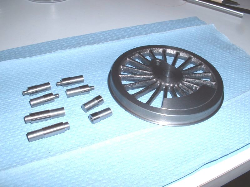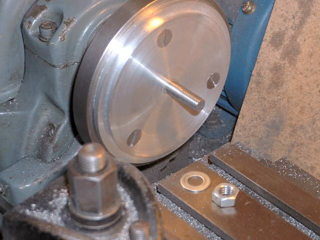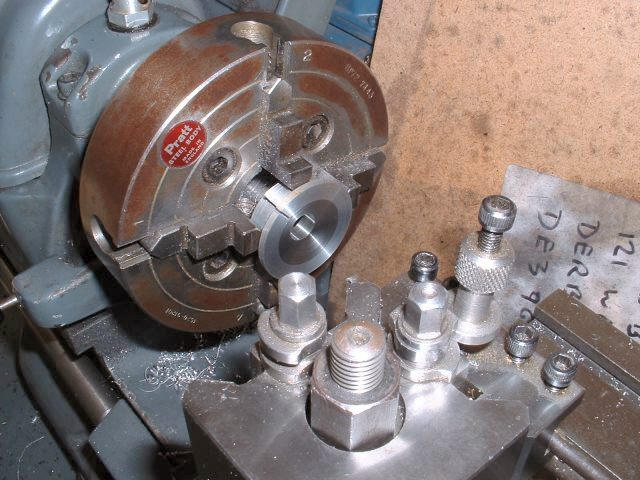 1 Helen Longish is going to be my version of Helen Long, the 4-8-4T tank locomotive jointly designed by LBSC and James Joslin. A brief construction series appeared in Model Engineer volumes 56 and 57. The loco was intended for the experienced builder and having read the articles I can see why! The construction notes and drawings are pretty vague and there seems to be a lot of discrepancies between the details. According to LBSC quite a few Helens were built but where are they all? There are a few photos on the 2 1/2" gauge forum of an unfinished Helen which I believe was sold by Station Road Steam some time ago. Gerald Chandler informs me that Ron Warren built a Helen some years ago but never steamed her. Apparently he has now decided to get her out of mothballs, so hopefully we may see her running in the future. I took a fancy to Helen when I first saw the design but decided to build a version incorporating some ideas of my own such as needle roller bearings on all axles, piston valve cylinders, and Gresley type conjugated valve gear for the middle cylinder. I will be producing a set of drawings as I go along which I will make available to the N25GA if the design is successful. I will also try and produce a set of drawings for Helen Long as described in ME. The original full size ones seem very hard to find. Work begins! The first job was to find some suitable wheel castings. I got in touch with Roger Palmer, who is in charge of the N2.5GA castings service and he suggested using 'Black Five' castings for the driving and coupled wheels so I ordered a set of 6 coupled and 2 drivers. They will only finish to about 3-5/16" in diameter ( *Helen's should be 3-3/8"* ) but that's not a problem. The Association is having a batch of bogie wheels made which are designed to finish at 1.5" diameter but they are not available yet. I could probably use a larger size but will wait for the new ones I think. *(Note - Although the initial description of Helen Long in Model Engineer for January 6th 1927 gives the driving wheel diameter as 3-3/8", the later construction notes actually give the diameter as 3-5/16") A start was made on machining the coupled wheels and the work went very well considering these were the first wheels I had ever turned from scratch! The castings had been ground fairly true on the outer edge of the flanges so they were set up in the 4 jaw chuck with the jaws gripping this ground edge and the outside of the wheels facing the tailstock. The casting was then adjusted so that the inside edge of the rim ran true. A skim was then taken over the tread so that the casting could then be reversed and held in the 3 jaw chuck for facing the back of the wheel and boring the axle hole. This ensured that the rims of the wheels would be truly concentric with the axles and not run eccentrically which looks dreadful! The rear of the wheel castings were faced off, taking care that the amount removed would ensure that the spokes would be central in the rim when the front of the rims were finish turned. The axle bore was drilled and finish reamed to 5/16". A skim was also taken off the edge of the flange to make sure it was concentric with the bore. All 8 wheels were finished to this stage in one go. The castings were then held by the flange with the back of the wheel casting hard up against the steps on the jaws to ensure true running. The centre bosses were then finished to the correct thickness. This was when a major snag showed up. The 2 driving wheels were from a different batch to the 6 coupled and were a lot thicker. Reducing the boss thickness on these 2 resulted in losing the nice shape of the centre boss as I had to take too much off. I could have got away with it if I had taken more off the back of the castings but it was too late now. I decided to scrap these 2 wheels and ordered two more of the coupled wheels.The balance weight will be made bigger to suit. At least all 8 wheels will then be identical as the spokes on the 2 odd castings were slightly different as well. A jig to finish the front of the rims, treads and flanges was then needed. I had a spare chuck backplate that I had used to true up the wheels on the Flying Scotsman so I decided to use this again. Ideally, the back plate wants to be slightly smaller than the diameter of the wheel flanges so that both edges of the flange can be finished at the same time but I didn't want to have to turn down the backplate. I had some aluminium blanks 3-3/4" diameter by 1/4" thick so I fastened one of these to the backplate with 0BA screws, faced it up and turned a step on the front to 1/4" diameter less than the finished diameter of the wheel flanges. The centre was drilled and tapped to take a stub of 3/8" dia. steel bar. This was then turned down to a good fit in the axle bores in the wheels and the end threaded to take a nut for holding the wheel casting for finishing ( as described by LBSC) The wheel turning jig Each wheel was then mounted on the jig in turn, the rims finished to 5/16" thick, and the flanges to 1/16" thick. The treads were turned to 1/4" wide and the flanges to 3/32" deep. The top-slide was set at an angle of 2 degrees for finish turning the treads. The diameters of the rough turned treads were measured and the wheel with the smallest diameter was finished first. The others were then turned to exactly the same diameter using the micrometer dial on the cross-slide. The edges of the flanges were rounded with a fine file, a small chamfer turned on the edge of the rims, and a small groove machined between the rims and the balance weights with a small 'vee' shaped tool. Finish turning the wheels on the jig Crankpin holes were drilled in my small vertical milling machine using the normal sort of jig and finish reamed to 7/32". Drilling for crankpins All that remains to do on the wheels now is clean up the spokes and enlarge the balance weights for the 2 driving wheels. The wheels were cast in a 2 part mould split on the centre