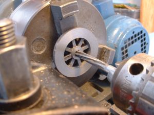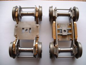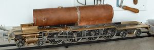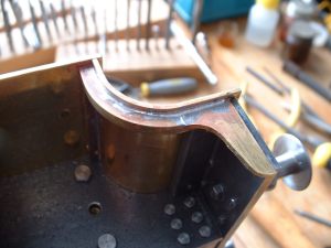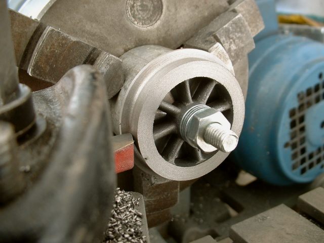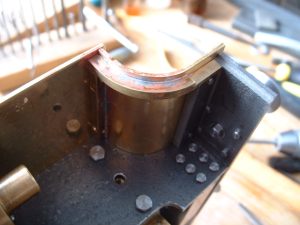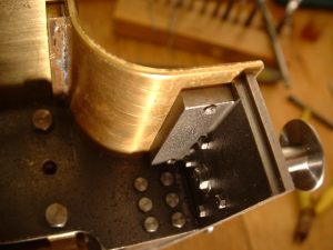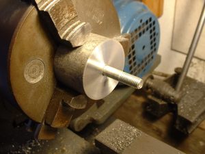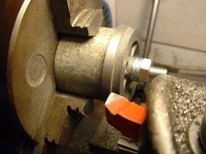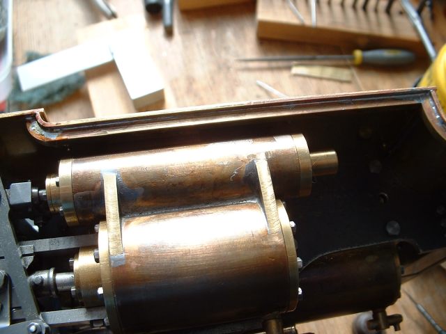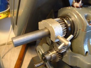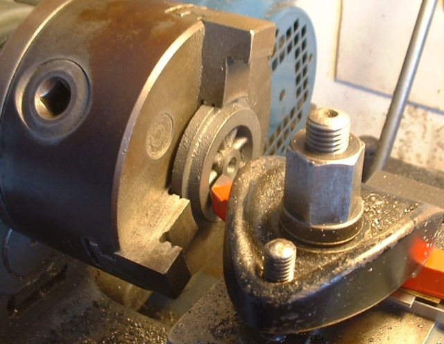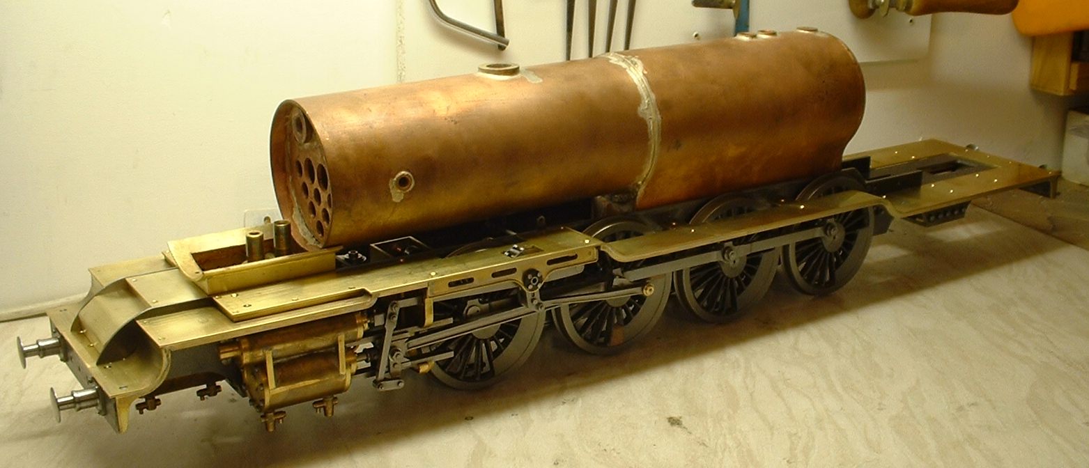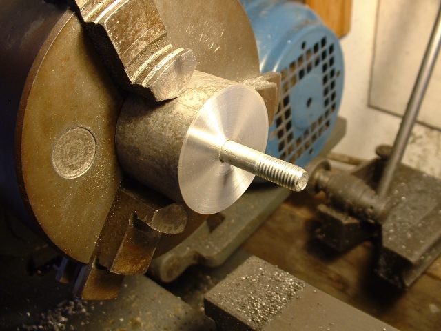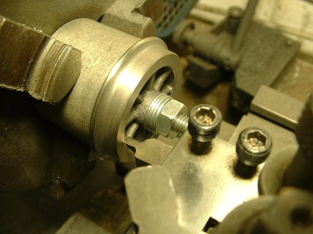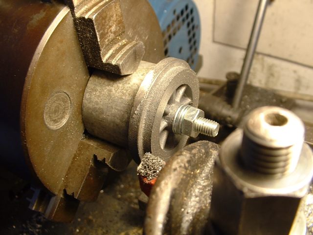 15 A bit of work now needed to be done to the two buffer beams. The front one needed the top outer sections reducing in width to match the bottom of the front section of the running boards and also the ends needed the rear corner milling to take the end of the valances. The rear beam just needed the ends milling for the valances. Mods to the front buffer beam The valances will be made mostly from 1/8" square brass as this is much easier to bend to the complex shape required than angle. The shaped ends that fit up to the buffer beams will be made from brass strip. As a matter of interest I borrowed my brother's bathroom scales (I haven't got any!) and weighed the loco as it is so far. Funny enough it's not as heavy as I thought. With the boiler and bogies in place it weighs about 28lbs but I reckon that when the tanks and cab etc are fitted it will clock in at about 40lbs. Still pretty heavy for a 2½" gauge loco I suppose. 21/03/2007 Work on the valances commenced at the front end with the short curved section just behind the buffer beam. A length of 1/8" aquare brass bar was annealed and bent around a piece of bar, 'adjusted' to fit the underside of the running board and trimmed to length. A recess was then milled in the front end to take the shaped part which butts up to the buffer beam. These 'fancy' bits will be cut from 18swg brass. The brass bar was then clamped in position and soft soldered in place in situ using a needle flame on the gas torch and ordinary 60/40 electrical solder. I thought it would be easier to solder the valances in place as I went along. The needle flame puts the heat just where you want it and means you can solder one bit without disturbing another. First section of valance soldered in place The shaped piece was then cut out roughly to shape and also soldered in place taking care not to solder it to the buffer beam as well! The final shape will be trimmed after the valances are finished and the running boards cleaned up. I dont think it will be necessary to fasten these bits to the buffer beams at all as they will be quite rigid. Shaped part soldered in place It was then just a case of cutting and bending more pieces of 1/8" square brass and soldering them in place. The long rear section was made in two pieces to make it easier to get the two double bends in the right place. Next section fitted Rear section completed When both sides are completed I'll take the running boards off and fit a few 10BA brass screws in strategic places and then resolder any joints that need it. Note - The bogie wheel castings have just arrived! (Thanks Roger!) I can now get on and finish the bogies and complete the chassis. 23/03/2007 After fitting the valances to both sides, the running boards were removed for final soldering. As it happens only a few joints needed 'touching up' and I didn't think it necessary to fit any more screws. Any imperfect joints were just clamped, some flux applied, and the joint reheated until the solder flowed. The running boards were then given a good scrub with soapy water to remove the flux and cleaned up with a piece of scouring pad. They were both then temporarily fitted to the chassis again for the final pieces to be made and fitted. These consisted of two short lengths on top of the buffer beams to fill the gap between the running boards and a cover to fit over the middle cylinder in front of the smokebox. It was decided to leave this cover loose as I may fit an oil resevoir under here to lubricate the inside motion. The completed running boards I'm still waiting for the brass tube for the smokebox to arrive but I picked up a three foot length of 4" diameter by 14swg brass tube off Ebay recently. If it comes to the worst I can use a piece of this and cut a strip out to reduce the diameter, then silver solder it back together as I did with the tube for the Flying Scotsman. I think the next job will be to turn the bogie wheels and complete the bogies. Then finish the boiler so I can get it tested and do a proper steam test! 25/03/2007 The bogie wheel castings were very clean with very little flash and machined easily with no tough skin or hard spots. I think they are the new ones for Ayesha II currently being described in Model Engineer. The first operation was to face the back of the wheels and drill and ream the bore for the axles. Measuring the castings showed that the inner edge of the rim was truly concentric with the tread and so the castings were simply chucked by the tread in the three jaw and about a 1/32" taken off the back of the casting. One thing to check when machining wheel castings is to see how much needs to be taken off to bring the wheel to the correct finished thickness and split this amount between the front and rear of the casting. It's easy to take too much of the front and machine the flared ends of the spokes off! After facing the rear of the wheel the bore for the axle was drilled and reamed 1/4" Diameter. This operation was then repeated on the other seven castings. It's much easier to carry out one operation at a time on all the castings rather than try and finish each wheel individually. By using the micrometer dials on the lathe it is easy to ensure all the wheels finish up the same thickness and diameter. Facing the back and drilling/reaming the bore The castings were then reversed in the chuck (gripping them by the tread) and the centre boss faced to the correct length. I could have also faced the rim to the correct thickness at this time but decided to leave that until the wheels were mounted on the jig to turn the treads etc. Facing the wheel boss to length I next required a true running jig to mount the wheels on for the final turning operations. This was simply a length of aluminium bar slightly smaller in diameter than the finished wheel diameter held in the chuck, faced off, and drilled and fitted with a piece of 1/4" steel bar threaded at the end for a nut to secure the castings in place. Simple jig for finish